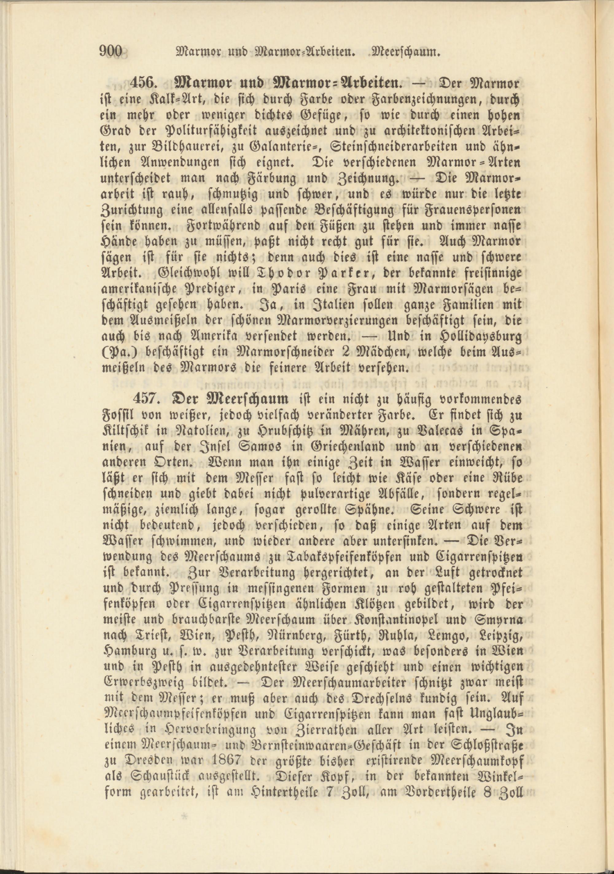 456. Marmor und Marmor-Arbeiten. — Der Marmor ist eine Kalk-Art, die sich durch Farbe oder Farbenzeichnungen, durch ein mehr oder weniger dichtes Gefügt, so wie durch einen hohen Grad der Politurfähigkeit auszeichnet und zu architektonischen Arbeiten, zur Bildhauerei, zu Galanterie-, Steinschneiderarbeiten und ähnlichen Anwendungen sich eignet. Die verschiedenen Marmor-Arten unterscheidet man nach Färbung und Zeichnung. — Die Marmorarbeit ist rauh, schmutzig und schwer, und es würde nur die letzte Zurichtung eine allenfalls passende Beschäftigung für Frauenspersonen sein können. Fortwährend auf den Füßen zu stehen und immer nasse Hände haben zu müssen, paßt nicht recht gut für sie. Auch Marmor sägen ist für sie nichts; denn auch dies ist eine nasse und schwere Arbeit. Gleichwohl will Thodor Parker, der bekannte freisinnige amerikanische Prediger, in Paris eine Frau mit Marmorsägen beschäftigt gesehen haben. Ja, in Italien sollen ganze Familien mit dem Ausmeißeln der schönen Marmorverzierungen beschäftigt sein, die auch bis nach Amerika versendet werden. — Und in Hollidapsburg (Pa.) beschäftigt ein Marmorschneider 2 Mädchen, welche beim Ausmeißeln des Marmors die feinere Arbeit versehen.