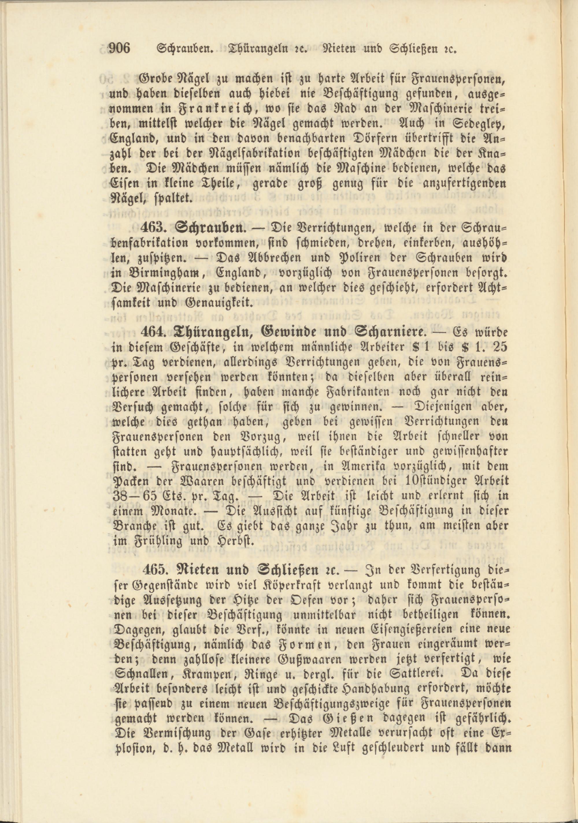 464. Thürangeln, Gewinde und Scharniere. — Es würde in diesem Geschäfte, in welchem männliche Arbeiter K 1 bis K 1. 25 pr. Tag verdienen, allerdings Verrichtungen geben, die von Frauenspersonen versehen werden könnten; da dieselben aber überall reinlichere Arbeit finden, haben manche Fabrikanten noch gar nicht den Versuch gemacht, solche für sich zu gewinnen. — Diejenigen aber, welche dies gethan haben, geben bei gewissen Verrichtungen den Frauenspersonen den Vorzug, weil ihnen die Arbeit schneller von statten geht und hauptsächlich, weil sie beständiger und gewissenhafter sind. — Frauenspersonen werden, in Amerika vorzüglich, mit dem Packen der Waaren beschäftigt und verdienen bei lOstündiger Arbeit 38—65 Ets. pr. Tag. — Die Arbeit ist leicht und erlernt sich in einem Monate. — Die Aussicht auf künftige Beschäftigung in dieser Branche ist gut. Es giebt das ganze Jahr zu thun, am meisten aber rm Frühling und Herbst.