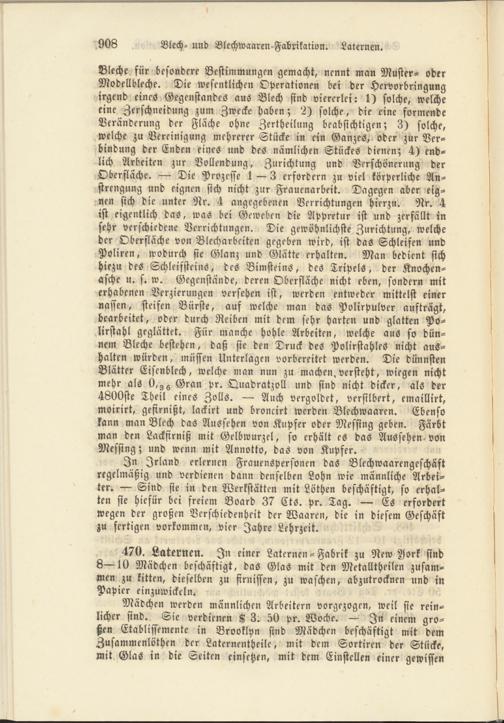 470. Laternen. In einer Laternen-Fabrik zu New Zlork sind 8—10 Mädchen beschäftigt, das Glas mit den Metalltheilen zusammen zu kitten, dieselben zu firnissen, zu waschen, abzutrocknen und in Papier einzuwickeln.