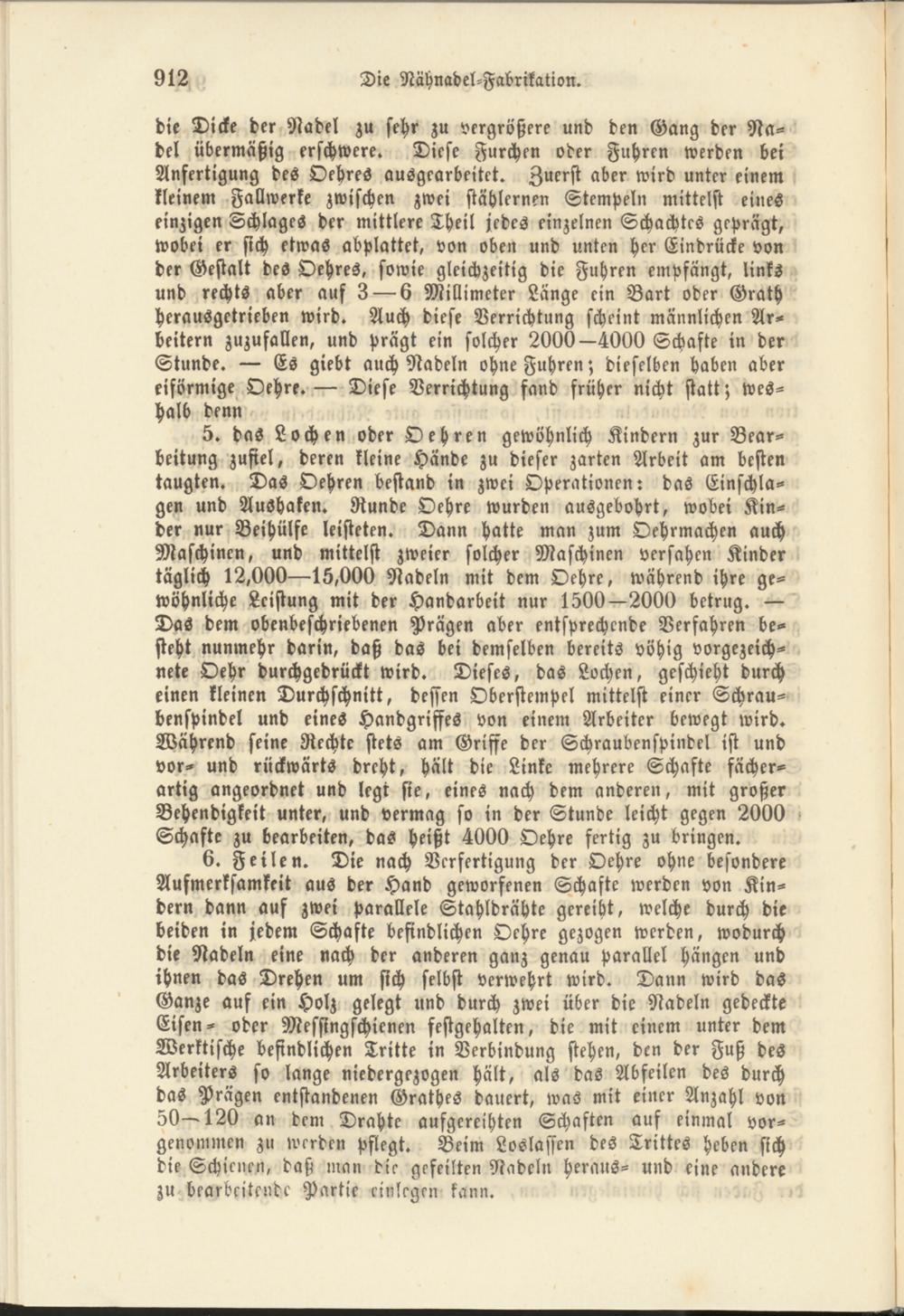 die Dicke der Nadel zu sehr zu vergrößere und den Gang der Nadel übermäßig erschwere. Diese Furchen oder Fuhren werden bei Anfertigung des OehreS ausgearbeitet. Zuerst aber wird unter einem kleinem Fallwerke zwischen zwei stählernen Stempeln mittelst eines einzigen Schlages der mittlere Theil jedes einzelnen Schachtes geprägt, wobei er sich etwas abplattet, von oben und unten her Eindrücke von der Gestalt des Oehres, sowie gleichzeitig die Fuhren empfangt, links und rechts aber auf 3 — 6 Millimeter Länge ein Bart oder Grath herausgetrieben wird. Auch diese Verrichtung scheint männlichen Arbeitern zuzufallen, und Prägt ein solcher 2000—4000 Schafte in der Stunde. — Es giebt auch Nadeln ohne Fuhren; dieselben haben aber eiförmige Oehre.— Diese Verrichtung fand früher nicht statt; weshalb denn