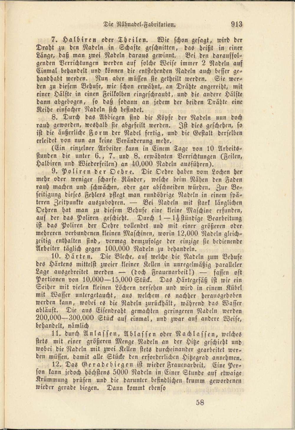 (Ein einzelner Arbeiter kann in Einem Tage von 10 Arbeitsstunden die unter 6., 7. und 8. erwähnten Verrichtungen (Feilen, Halbiren und Wiederfeilen) an 40,000 Nadeln ausführen).