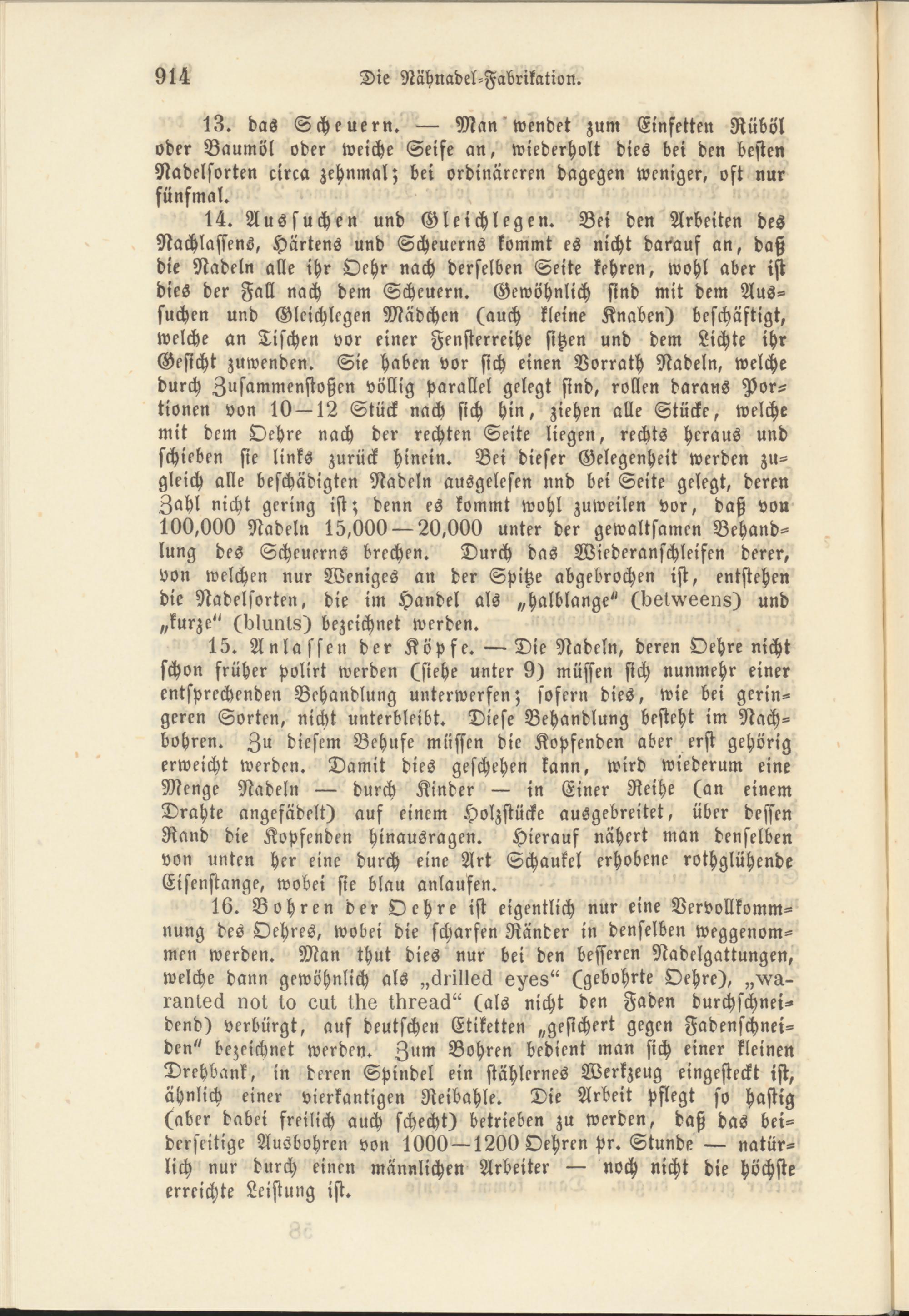 13. das Scheuern. — Man'wendet zum Einfetten Rüböl oder Baumöl oder weiche Seife an, wiederholt dies bei den besten Nadelsorten circa zehnmal; bei ordinäreren dagegen weniger, oft nur fünfmal.