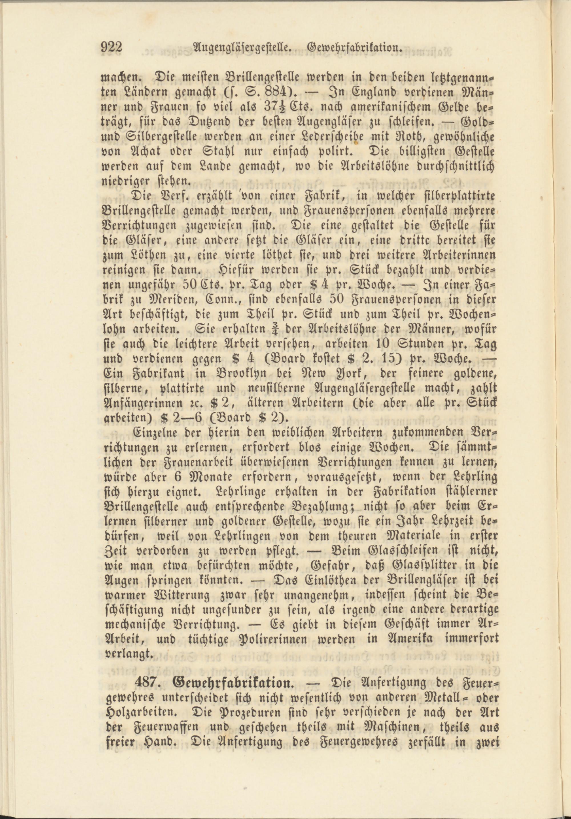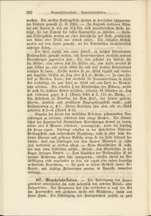 machen. Die meisten Brillengestelle werden in den beiden letztgenannten Ländern gemacht (s. S. 864). — In England verdienen Männer und Frauen so viel als 37H Cts. nach amerikanischem Gelde beträgt, für das Dutzend der besten Augengläser zu schleifen. — Gold- und Silbergestelle werden an einer Lederscheihe mit Roth, gewöhnliche von Achat oder Stahl nur einfach polirt. Die billigsten Gestelle werden auf dem Lande gemacht, wo die Arbeitslöhne durchschnittlich niedriger stehen.