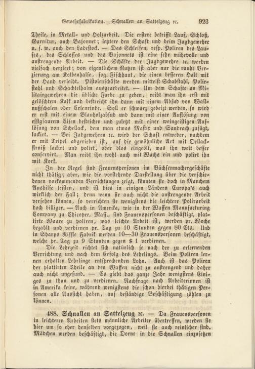 In der Regel sind Frauenspersonen im Büchsenmachergeschäfte nicht thätig; aber, wie die vorstehende Darstellung über die verschiedenen vorkommenden Verrichtungen zeigt, könnten sie doch in Manchem Aushilfe leisten, und ist dies in einigen Ländern Europa's auch wirklich der Fall; denn wenn sie auch nicht die anstrengende Arbeit versehen können, so verrichten sie wenigstens die leichtere Polirarbeit doch billiger. — Auch in Amerika, wie in der Waffen Manufacturing Company zu Chicopee, Mass., sind Frauenspersonen beschäftigt, plat- tirte Waare zu poliren, was leichte Arbeit ist, werden pr. Woche bezahlt und verdienen pr. Tag zu 10 Stunden gegen 80 Cts. Und in Sharps Riffle Fabrik werden 10—30 Frauenspersonen beschäftigt, Welche pr. Tag zu 9 Stunden gegen K 1 verdienen.