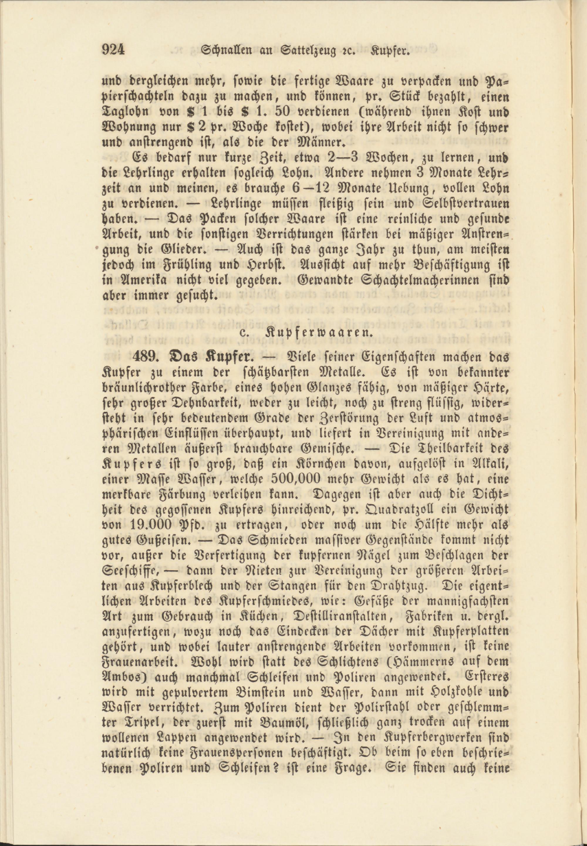 489. Das Kupfer. — Viele seiner Eigenschaften machen das Kupfer zu einem der schätzbarsten Metalle. Es ist von bekannter bräunlichrother Farbe, eines hohen Glanzes fähig, von mäßiger Härte, sehr großer Dehnbarkeit, weder zu leicht, noch zu streng flüssig, widersteht in sehr bedeutendem Grade der Zerstörung der Lust und atmosphärischen Einflüssen überhaupt, und liefert in Vereinigung mit anderen Metallen äußerst brauchbare Gemische. — Die Theilbarkeit des Kupfers ist so groß, daß ein Körnchen davon, aufgelöst in Alkali, einer Masse Wasser, welche 500,000 mehr Gewicht als es hat, eine merkbare Färbung verleihen kann. Dagegen ist aber auch die Dichtheit des gegossenen Kupfers hinreichend, pr. Quadratzoll ein Gewicht von 19.000 Pfd. zu ertragen, oder noch um die Halste mehr als gutes Gußeisen. — Das Schmieden massiver Gegenstände kommt nicht vor, außer die Verfertigung der kupfernen Nagel zum Beschlagen der Seeschisse, — dann der Nieten zur Vereinigung der größeren Arbeiten aus Kupferblech und der Stangen für den Drahtzug. Die eigentlichen Arbeiten des Kupferschmiedes, wie: Gefäße der mannigfachsten Art zum Gebrauch in Küchen, Destilliranstalten, Fabriken u. dergl. anzufertigen, wozu noch das Eindecken der Dächer mit Kupferplatten gehört, und wobei lauter anstrengende Arbeiten vorkommen, ist keine Frauenarbeit. Wohl wird statt des Schlichtens (Hammerns auf dem Ambos) auch manchmal Schleifen und Poliren angewendet. Ersteres wird mit gepulvertem Bimstein und Wasser, dann mit Holzkohle und Wasser verrichtet. Zum Poliren dient der Polirstahl oder geschlemm- ter Tripel, der zuerst mit Baumöl, schließlich ganz trocken auf einem wollenen Lappen angewendet wird. — In den Kupferbergwerken sind natürlich keine Frauenspersonen beschäftigt. Ob beim so eben beschriebenen Poliren und Schleifen? ist eine Frage. Sie finden auch keine