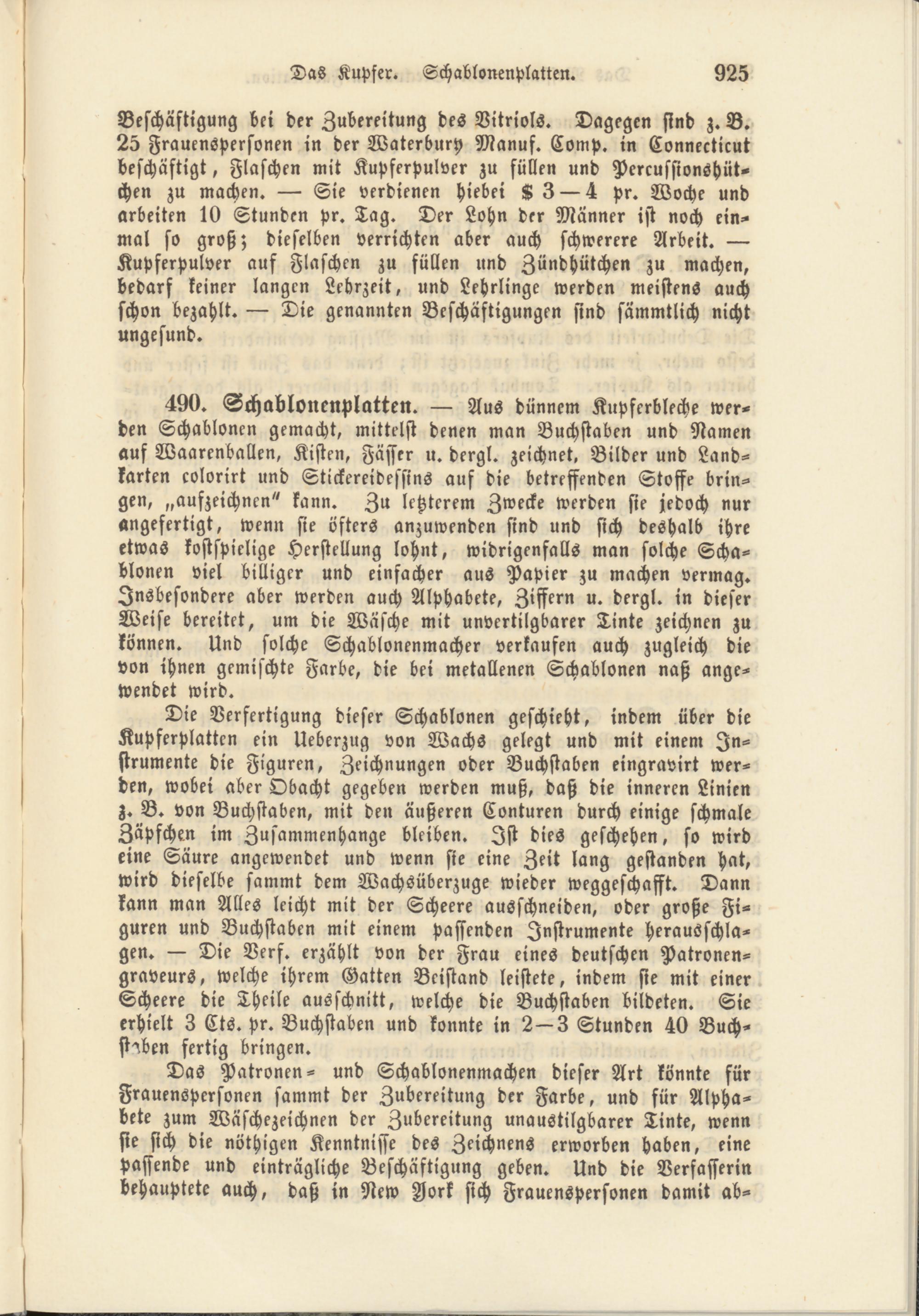 Beschäftigung bei der Zubereitung des Vitriols. Dagegen sind z. B. 25 Frauenspersonen in der Waterbury Manuf. Comp. in Connecticut beschäftigt, Flaschen mit Kupferpulver zu füllen und Percussionshüt- chen zu machen. — Sie verdienen Hiebei K 3 — 4 pr. Woche und arbeiten 10 Stunden pr. Tag. Der Lohn der Männer ist noch einmal so groß; dieselben verrichten aber auch schwerere Arbeit. — Kupferpulver auf Flaschen zu füllen und Zündhütchen zu machen, bedarf keiner langen Lehrzeit, und Lehrlinge werden meistens auch schon bezahlt. — Die genannten Beschäftigungen sind sämmtlich nicht ungesund.