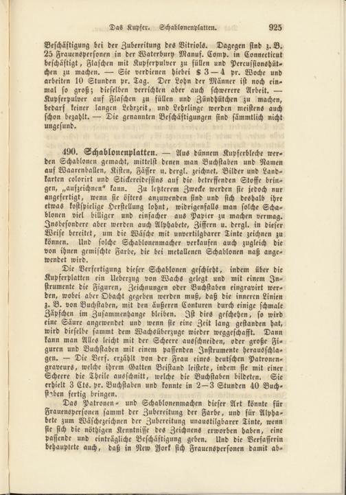 Das Patronen- und Schablonenmachen dieser Art könnte für Frauenspersonen sammt der Zubereitung der Farbe, und für Alphabete zum Wäschezeichnen der Zubereitung unaustilgbarer Tinte, wenn sie sich die nöthigen Kenntnisse des Zeichnens erworben haben, eine passende und einträgliche Beschäftigung geben. Und die Verfasserin behauptete auch, daß in New Ilork sich Frauenspersonen damit ab-