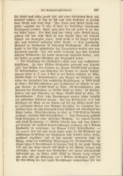 Die Darstellung der Stecknadeln ersieht man aus nachstehender Aufzählung. Zu einer Million Stecknadeln gebraucht man folgende Zeit: Zum Richten des Drahtes, pr. Stunde 28,800 Stück gerechnet, 35 Arbeitsstunden; zum Schneiden der Drähte in einzelne Schäfte, woraus später 2, 3 oder 4 Mal so viel Nadeln entstehen, pr. Stde. 90,000 Stück, 11 Arbeitsstunden; zum Spitzen am Spitzrade, eine früher der Gesundheit sehr nachtheilige Beschäftigung, zu 3800 Stück pr. Stde., 263 Arbeitsstunden; zum Zerschneiden der Schafte in einzelne Nadeln, zu 12,000 Stück pr. Stde., 83 Arbeitsstunden; zum Spinnen des Kopfdrahtes, zu 36,000 Stück pr. Stde., 28 Arbeitsstunden, und zum Schneiden der Köpfe, 30,000 Stück pr. Stde., 33 Arbeitsstunden. Diese sechs Verrichtungen wurden bisher lediglich von männlichen Arbeitern besorgt. Nur das Anköpfen, d. h. das Befestigen der Köpfe an die Nadeln auf der sog. Wippe wurde früher gewöhnlich Knaben oder Mädchen überlassen, da erwachsene Individuen hiezu oft nicht hinlänglich feinen Fühlsinn und Gelenkigkeit der Finger hatten. Diese Verrichtung zu thun, zu 1100 Stück pr. Stunde gerechnet, erforderte 909 Arbeitsstunden. — Ihre Vollendung geschieht durch Reinigung in einer chemischen Mischung, bei besseren Sorten auch durch Verzinnung. — Mithin bedurfte man nach dem bisherigen Prozesse, wo meistens Handverrichtungen vorkamen, um 1 Million Stecknadeln zu verfertigen, im Ganzen 13 62 Arbeitsstunden. — In neuerer Zeit hat man jedoch immer mehr, da sich Maschinen zur vollständigen Herstellung von Stecknadeln nicht bewährt haben, Hilfs- maschinen eingeführt, und es sind nunmehr namentlich solche im Gange, welche die vollständige Verfertigung der Stecknadelköpfe, die obigen letzten 3 Verrichtungen so besorgen, daß sie für große Nadeln 112 und für kleine Nadeln 160 Köpfe in der Minute fertigen und anbringen, oder nimmt man Ausschießen und andere unvermeidliche Störungen an, im Mittel 4500 Stück pr. Stunde fertig bringen und man also zur Anköpfung von 1 Million Stecknadeln statt der für Verrichtung der drei letzten Verrichtungen nothwendigen Zeit von