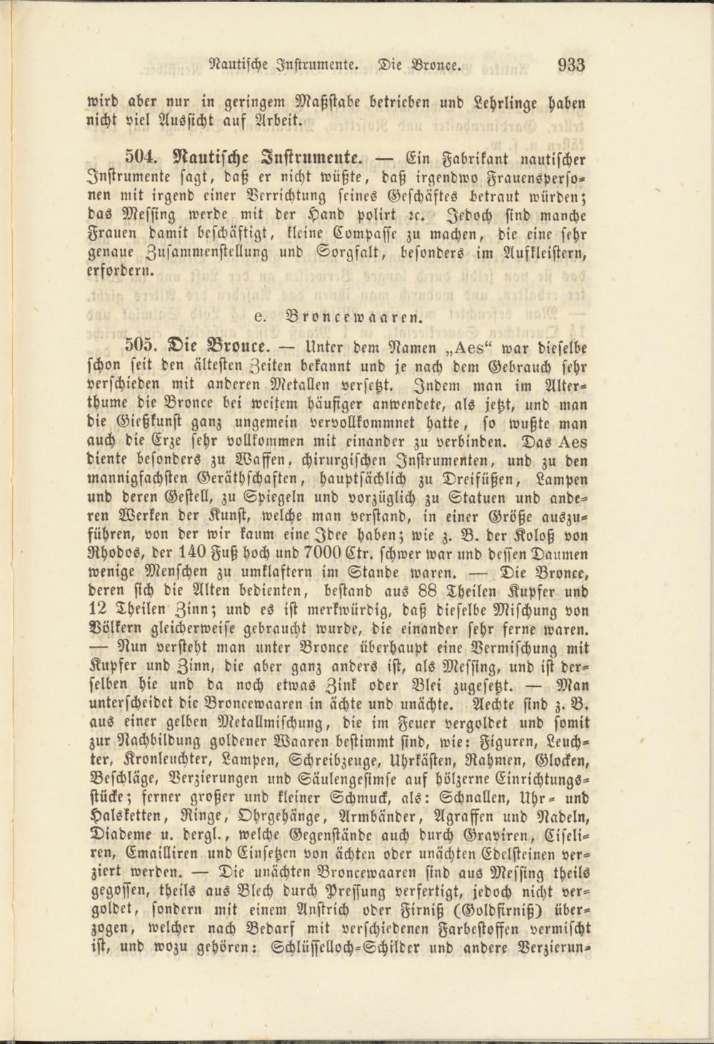504. Nautische Instrumente. — Ein Fabrikant nautischer Instrumente sagt, daß er nicht wüßte, daß irgendwo Frauenspersonen mit irgend einer Verrichtung seines Geschäftes betraut würden; das Messing werde mit der Hand polirt rc. Jedoch sind manche Frauen damit beschäftigt, kleine Compasse zu machen, die eine sehr genaue Zusammenstellung und Sorgfalt, besonders im Aufkleistern, erfordern.
