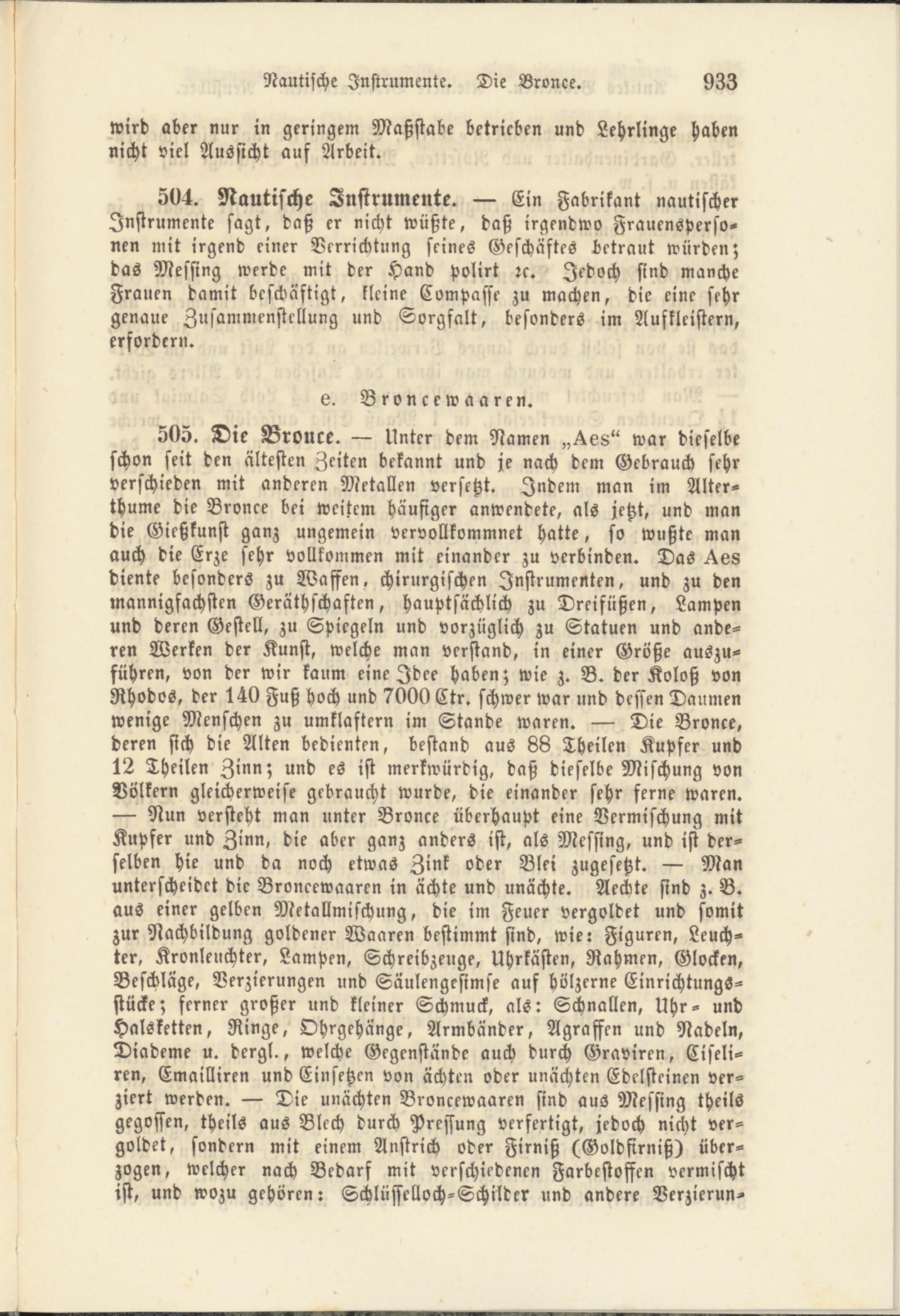 505. Die Bronce. — Unter dem Namen „^68" war dieselbe schon seit den ältesten Zeiten bekannt und je nach dem Gebrauch sehr verschieden mit anderen Metallen versetzt. Indem man im Alterthume die Bronce bei weitem häufiger anwendete, als jetzt, und man die Gießkunst ganz ungemein vervollkommnet hatte, so wußte man auch die Erze sehr vollkommen mit einander zu verbinden. Das ^68 diente besonders zu Waffen, chirurgischen Instrumenten, und zu den mannigfachsten Geräthschaften, hauptsächlich zu Dreifüßen, Lampen und deren Gestell, zu Spiegeln und vorzüglich zu Statuen und anderen Werken der Kunst, welche man verstand, in einer Größe auszuführen, von der wir kaum eine Idee haben; wie z. B. der Koloß von Rhodos, der 140 Fuß hoch und 7000 Ctr. schwer war und dessen Daumen wenige Menschen zu umklaftern im Stande waren. — Die Bronce, deren sich die Alten bedienten, bestand aus 88 Theilen Kupfer und 12 Theilen Zinn; und es ist merkwürdig, daß dieselbe Mischung von Völkern gleicherweise gebraucht wurde, die einander sehr ferne waren. — Nun versteht man unter Bronce überhaupt eine Vermischung mit Kupfer und Zinn, die aber ganz anders ist, als Messing, und ist derselben hie und da noch etwas Zink oder Blei zugesetzt. — Man unterscheidet die Broncewaaren in ächte und unächte. Aechte sind z. B. aus einer gelben Metallmischung, die im Feuer vergoldet und somit zur Nachbildung goldener Waaren bestimmt sind, wie: Figuren, Leuchter, Kronleuchter, Lampen, Schreibzeuge, Uhrkästen, Rahmen, Glocken, Beschläge, Verzierungen und Säulengesimse auf hölzerne Einrichtungsstücke; ferner großer und kleiner Schmuck, als: Schnallen, Uhr- und Halsketten, Ringe, Ohrgehänge, Armbänder, Agraffen und Nadeln, Diademe u. dergl., welche Gegenstände auch durch Graviren, Ciseli- ren, Emailliren und Einsetzen von ächten oder unächten Edelsteinen verziert werden. — Die unächten Broncewaaren sind aus Messing theils gegossen, theils aus Blech durch Pressung verfertigt, jedoch nicht vergoldet, sondern mit einem Anstrich oder Firniß (Goldfirniß) überzogen, welcher nach Bedarf mit verschiedenen Farbestoffen vermischt ist, und wozu gehören: Schlüsselloch-Schilder und andere Verzier»»-