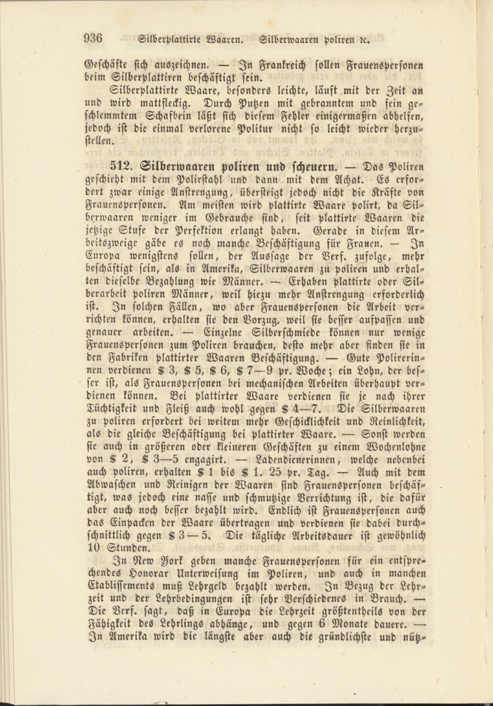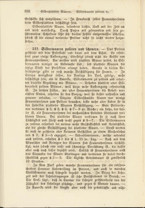 Zn New Zjork geben manche Frauenspersonen für ein entsprechendes Honorar Unterweisung im Poliren, und auch in manchen Etablissements muß Lehrgeld bezahlt werden. In Bezug der Lehrzeit und der Lehrbedingungen ist sehr Verschiedenes in Brauch. — Die Verf. sagt, daß in Europa die Lehrzeit größtentheils von der Fähigkeit des Lehrlings abhänge, und gegen 6 Monate dauere. — In Amerika wird die längste aber auch die gründlichste und nütz-