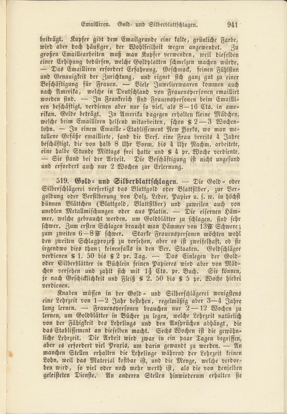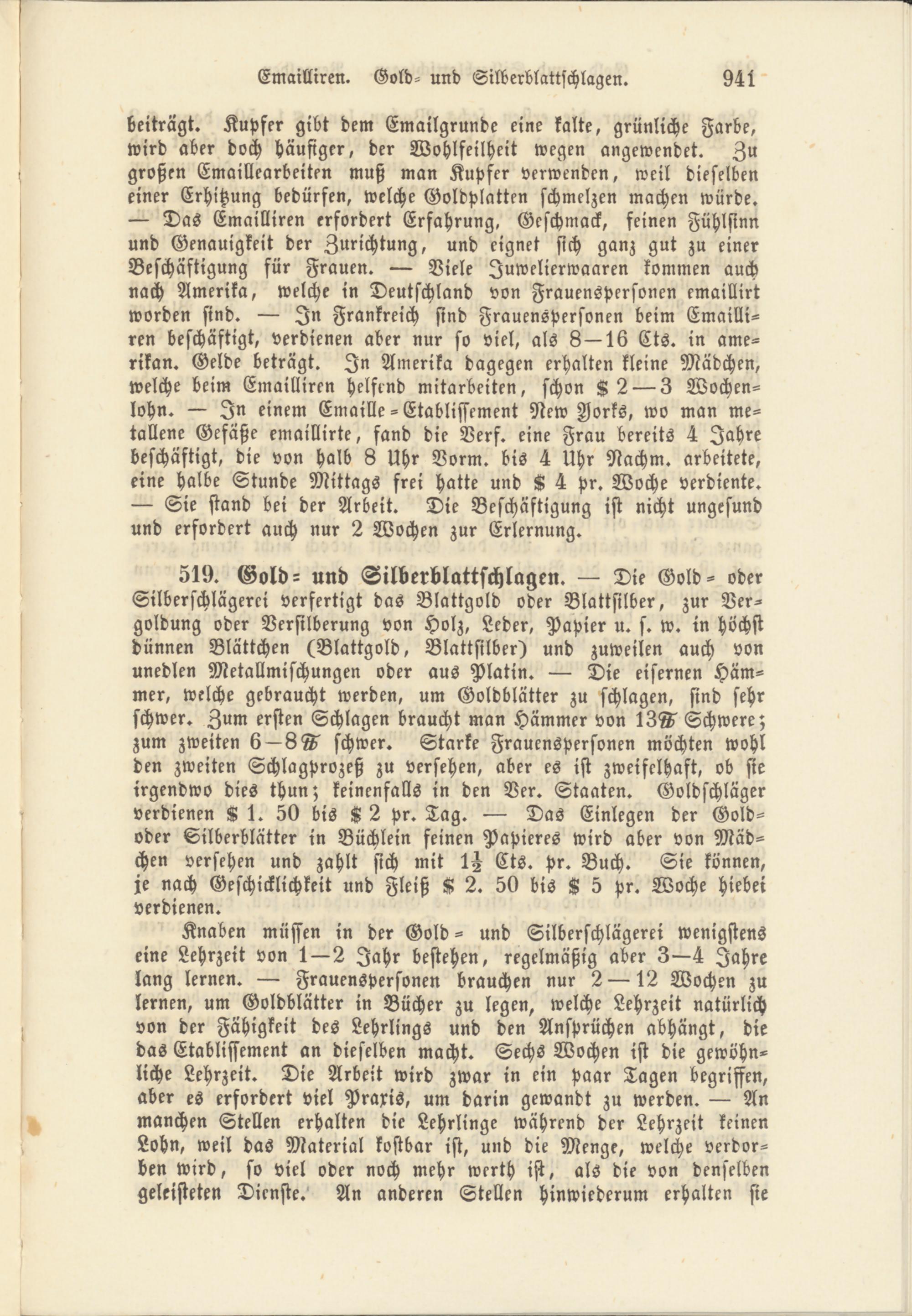 519. Gold- und Silberblattschlagen. — Die Gold- oder Silberschlägerei verfertigt das Blattgold oder Blattsilber, zur Vergoldung oder Versilberung von Holz, Leder, Papier u. s. w. in höchst dünnen Blättchen (Blattgold, Blattsilber) und zuweilen auch von unedlen Metallmischungen oder aus Platin. — Die eisernen Häm- mer, welche gebraucht werden, um Goldblätter zu schlagen, sind sehr schwer. Zum ersten Schlagen braucht man Hämmer von 13A Schwere; zum zweiten 6 —8T schwer. Starke Frauenspersonen möchten wohl den zweiten Schlagprozeß zu versehen, aber es ist zweifelhaft, ob sie irgendwo dies thun; keinenfalls in den Ver. Staaten. Goldschläger verdienen K 1. 50 bis K 2 Pr. Tag. — Das Einlegen der Goldoder Silberblätter in Büchlein feinen Papieres wird aber von Mädchen versehen und zahlt sich mit Cts. Pr. Buch. Sie können, je nach Geschicklichkeit und Fleiß K 2. 50 bis K 5 pr. Woche Hiebei verdienen.