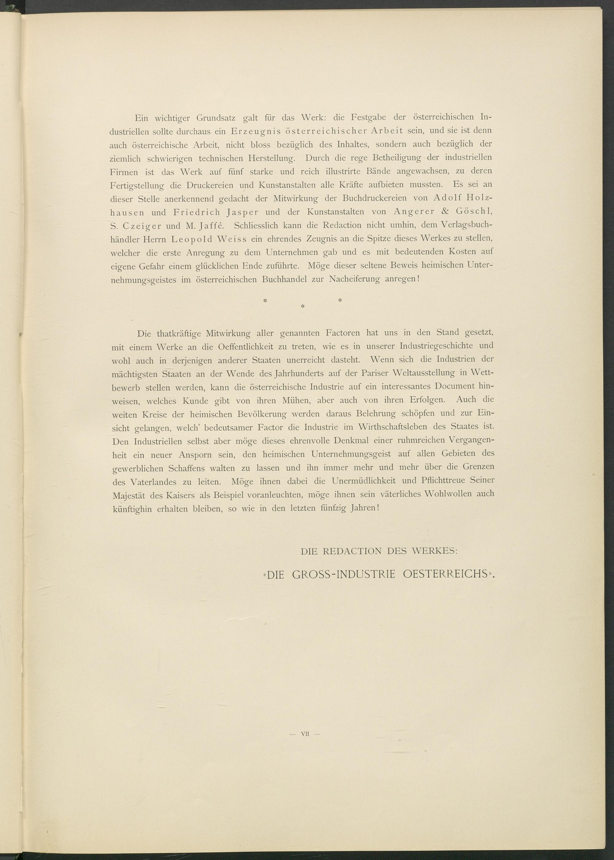 Ein wichtiger Grundsatz galt für das Werk: die Festgabe der österreichischen Industriellen sollte durchaus ein Erzeugnis österreichischer Arbeit sein, und sie ist denn auch österreichische Arbeit, nicht bloss bezüglich des Inhaltes, sondern auch bezüglich der ziemlich schwierigen technischen Herstellung. Durch die rege Betheiligung der industriellen Firmen ist das Werk auf fünf starke und reich illustrirte Bände angewachsen, zu deren Fertigstellung die Druckereien und Kunstanstalten alle Kräfte aufbieten mussten. Es sei an dieser Stelle anerkennend gedacht der Mitwirkung der Buchdruckereien von Adolf Holzhausen und Friedrich Jasper und der Kunstanstalten von Angerer & Göschl, S. Czeiger und M. Jaffé. Schliesslich kann die Rédaction nicht umhin, dem Verlagsbuchhändler Herrn Feopold Weiss ein ehrendes Zeugnis an die Spitze dieses Werkes zu stellen, welcher die erste Anregung zu dem Unternehmen gab und es mit bedeutenden Kosten auf eigene Gefahr einem glücklichen Ende zuführte. Möge dieser seltene Beweis heimischen Unternehmungsgeistes im österreichischen Buchhandel zur Nacheiferung anregen !