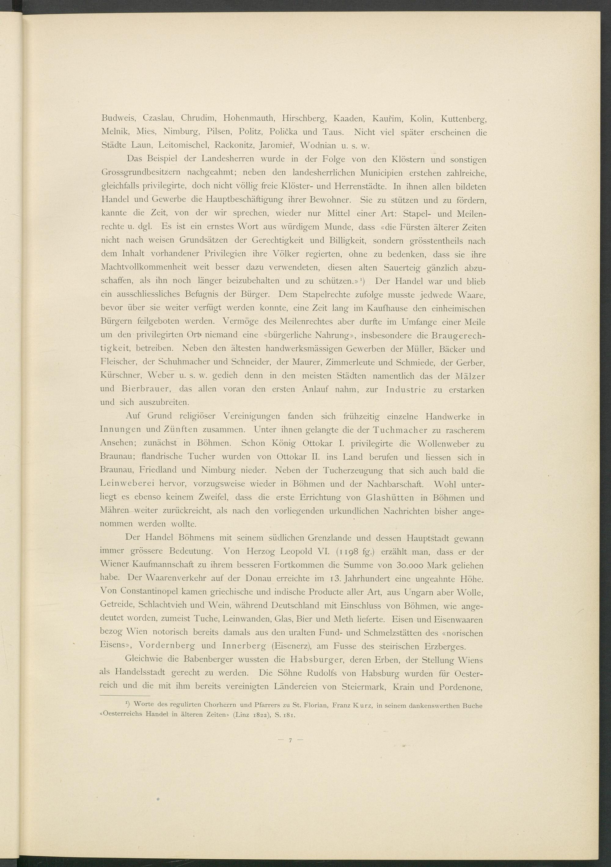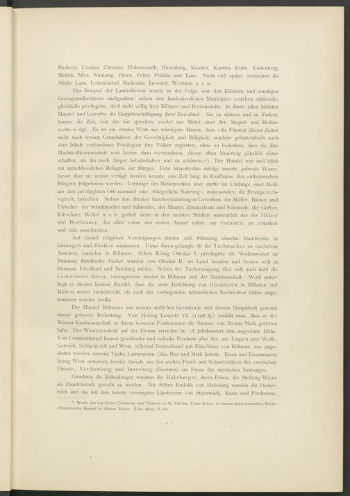 Der Handel Böhmens mit seinem südlichen Grenzlande und dessen Hauptstadt gewann immer grössere Bedeutung. Von Herzog Leopold VI. (1198 fg.) erzählt man, dass er der Wiener Kaufmannschaft zu ihrem besseren Fortkommen die Summe von 3 o.ooo Mark geliehen habe. Der Waarenverkehr auf der Donau erreichte im 1 3 . Jahrhundert eine ungeahnte Höhe. Von Constantinopel kamen griechische und indische Producte aller Art, aus Ungarn aber Wolle, Getreide, Schlachtvieh und’Wein, während Deutschland mit Einschluss von Böhmen, wie angedeutet worden, zumeist Tuche, Leinwänden, Glas, Bier und Meth lieferte. Eisen und Eisenwaaren bezog Wien notorisch bereits damals aus den uralten Fund- und Schmelzstätten des «norischen Eisens», Vordernberg und Innerberg (Eisenerz), am Fusse des steirischen Erzberges.