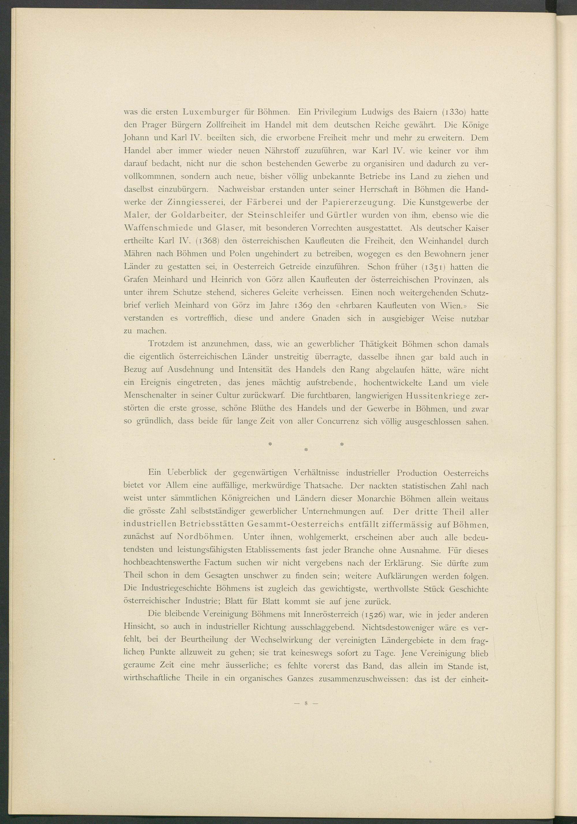 Trotzdem ist anzunehmen, dass, wie an gewerblicher Thätigkeit Böhmen schon damals die eigentlich österreichischen Länder unstreitig überragte, dasselbe ihnen gar bald auch in Bezug auf Ausdehnung und Intensität des Handels den Rang abgelaufen hätte, wäre nicht ein Ereignis eingetreten, das jenes mächtig aufstrebende, hochentwickelte Land um viele Menschenalter in seiner Cultur zurückwarf. Die furchtbaren, langwierigen Hussitenkriege zer- störten die erste grosse, schöne Blüthe des Handels und der Gewerbe in Böhmen, und zwar so gründlich, dass beide für lange Zeit von aller Concurrenz sich völlig ausgeschlossen sahen.