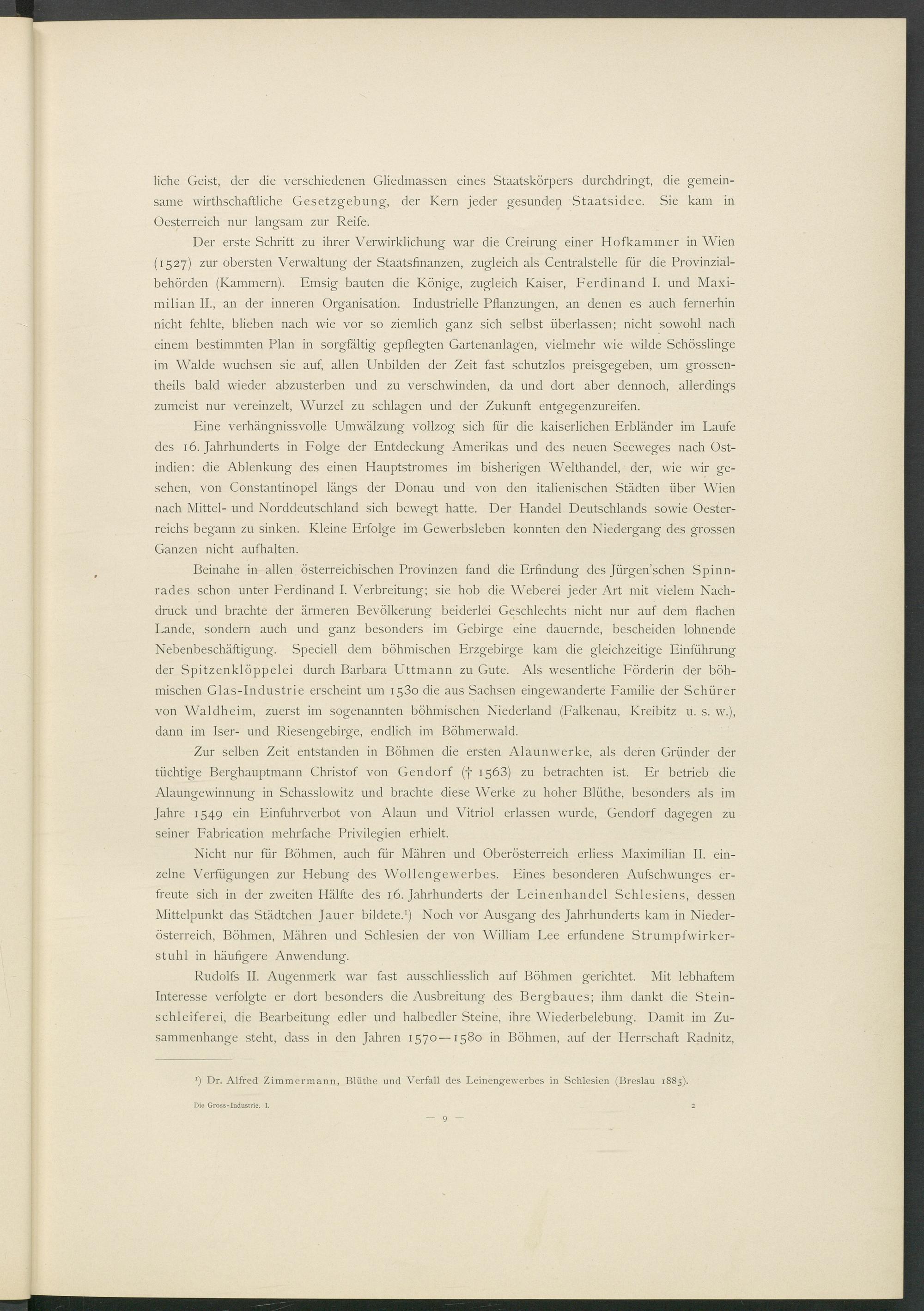 Der erste Schritt zu ihrer Verwirklichung war die Creirung einer Hofkammer in Wien (1527) zur obersten Verwaltung der Staatsfinanzen, zugleich als Centralstelle für die Provinzialbehörden (Kammern). Emsig bauten die Könige, zugleich Kaiser, Ferdinand I. und Maximilian II., an der inneren Organisation. Industrielle Pflanzungen, an denen es auch fernerhin nicht fehlte, blieben nach wie vor so ziemlich ganz sich selbst überlassen; nicht sowohl nach einem bestimmten Plan in sorgfältig gepflegten Gartenanlagen, vielmehr wie wilde Schösslinge im Walde wuchsen sie auf, allen Unbilden der Zeit fast schutzlos preisgegeben, um grossen- theils bald wieder abzusterben und zu verschwinden, da und dort aber dennoch, allerdings zumeist nur vereinzelt, Wurzel zu schlagen und der Zukunft entgegenzureifen.