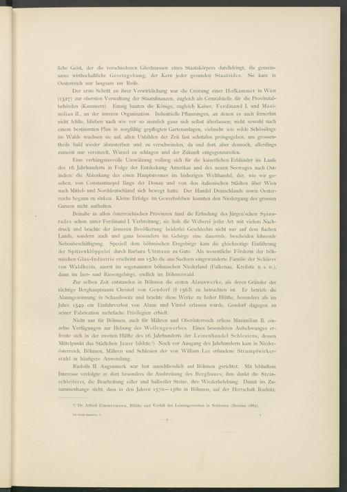 Beinahe in allen österreichischen Provinzen fand die Erfindung des Jürgen’schen Spinnrades schon unter Ferdinand I. Verbreitung; sie hob die Weberei jeder Art mit vielem Nachdruck und brachte der ärmeren Bevölkerung beiderlei Geschlechts nicht nur auf dem flachen Lande, sondern auch und ganz besonders im Gebirge eine dauernde, bescheiden lohnende Nebenbeschäftigung. Speciell dem böhmischen Erzgebirge kam die gleichzeitige Einführung der Spitzenklöppelei durch Barbara Uttmann zu Gute. Als wesentliche Förderin der böhmischen Glas-Industrie erscheint um 1 53 o die aus Sachsen eingewanderte Familie der Schürer von Waldheim, zuerst im sogenannten böhmischen Niederland (Falkenau, Kreibitz u. s. w.), dann im Iser- und Riesengebirge, endlich im Böhmerwald.