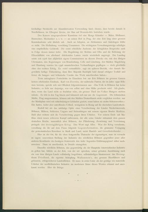 Rudolf fiel als das unblutige Opfer einer Verschwörung der Länder Niederösterreich, Böhmen, Mähren, Schlesien, Ungarn und Siebenbürgen mit seinem eigenen Bruder Mathias. Bald aber richtete sich die Verschwörung gegen ihren Urheber. Vor seinem Ende sah Mathias einen neuen schweren Kampf entbrennen, der alle seine Länder mitsammt dem ganzen deutschen Reiche, namentlich aber Böhmen, der Plünderung, Zerstörung und Verwüstung preisgab: den dreissigjährigen Krieg. Das Wort sagt Alles. Was der Krieg verschonte, verschlang die ihr auf dem Fusse folgende Gegenreformation, die grausame Verjagung der protestantischen Bewohner in Stadt und Land, meist Handel- und Gewerbetreibender. . . .
