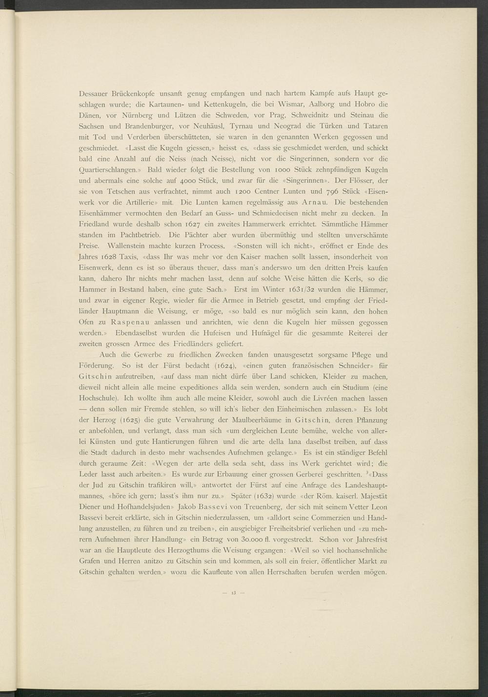Dessauer Brückenköpfe unsanft genug empfangen und nach hartem Kampfe aufs Haupt geschlagen wurde; die Kartaunen- und Kettenkugeln, die bei Wismar, Aalborg und Hobro die Dänen, vor Nürnberg und Lützen die Schweden, vor Prag, Schweidnitz und Steinau die Sachsen und Brandenburger, vor Neuhäusl, Tyrnau und Neograd die Türken und Tataren mit Tod und Verderben überschütteten, sie waren in den genannten Werken gegossen und geschmiedet. «Lasst die Kugeln giessen,» heisst es, «dass sie geschmiedet werden, und schickt bald eine Anzahl auf die Neiss (nach Neisse), nicht vor die Singerinnen, sondern vor die Quartierschlangen.» Bald wieder folgt die Bestellung von 1000 Stück zehnpfündigen Kugeln und abermals eine solche auf 4000 Stück, und zwar für die «Singerinnen». Der Flösser, der sie von Tetschen aus verfrachtet, nimmt auch 1200 Centner Lunten und 796 Stück «Eisenwerk vor die Artillerie» mit. Die Lunten kamen regelmässig aus Arnau. Die bestehenden Eisenhämmer vermochten den Bedarf an Guss- und Schmiedeeisen nicht mehr zu decken. In Friedland wurde deshalb schon 1627 ein zweites Hammerwerk errichtet. Sämmtliche Hämmer standen im Pachtbetrieb. Die Pächter aber wurden übermüthig und stellten unverschämte Preise. Wallenstein machte kurzen Process. «Sonsten will ich nicht», eröffnet er Ende des Jahres 1628 Taxis, «dass Ihr was mehr vor den Kaiser machen sollt lassen, insonderheit von Eisenwerk, denn es ist so überaus theuer, dass man’s anderswo um den dritten Preis kaufen kann, dahero Ihr nichts mehr machen lasst, denn auf solche Weise hätten die Kerls, so die Hammer in Bestand haben, eine gute Sach.» Erst im Winter i63i/32 wurden die Hämmer, und zwar in eigener Regie, wieder für die Armee in Betrieb gesetzt, und empfing der Friedländer Hauptmann die Weisung, er möge, «so bald es nur möglich sein kann, den hohen Ofen zu Raspenau anlassen und anrichten, wie denn die Kugeln hier müssen gegossen werden.» Ebendaselbst wurden die Hufeisen und Hufnägel für die gesammte Reiterei der zweiten grossen Armee des Friedländers geliefert.
