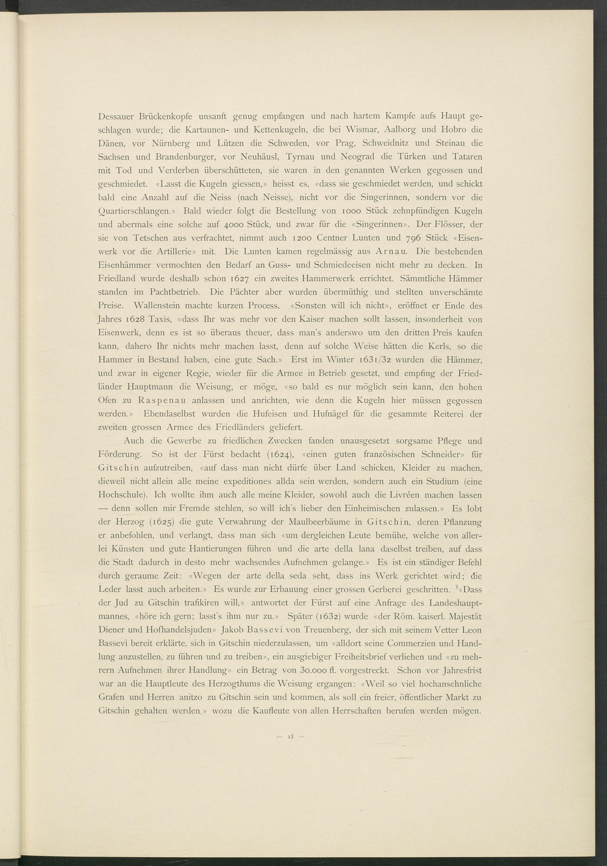 Auch die Gewerbe zu friedlichen Zwecken fanden unausgesetzt sorgsame Pflege und Förderung. So ist der Fürst bedacht (1624), «einen guten französischen Schneider» für Gitschin aufzutreiben, «auf dass man nicht dürfe über Land schicken, Kleider zu machen, dieweil nicht allein alle meine expeditiones allda sein werden, sondern auch ein Studium (eine Hochschule). Ich wollte ihm auch alle meine Kleider, sowohl auch die Livreen machen lassen — denn sollen mir Fremde stehlen, so will ich’s lieber den Einheimischen zulassen.» Es lobt der Herzog (1625) die gute Verwahrung der Maulbeerbäume in Gitschin, deren Pflanzung er anbefohlen, und verlangt, dass man sich «um dergleichen Leute bemühe, welche von allerlei Künsten und gute Hantierungen führen und die arte della lana daselbst treiben, auf dass die Stadt dadurch in desto mehr wachsendes Aufnehmen gelange.» Es ist ein ständiger Befehl durch geraume Zeit: «Wegen der arte della seda seht, dass ins Werk gerichtet wird; die Leder lasst auch arbeiten.» Es wurde zur Erbauung einer grossen Gerberei geschritten. '«Dass der Jud zu Gitschin trafikiren will,» antwortet der Fürst auf eine Anfrage des Landeshauptmannes, «höre ich gern; lasst’s ihm nur zu.» Später (i632) wurde «der Röm. kaiserl. Majestät Diener und Hofhandelsjuden» Jakob Bassevi von Treuenberg, der sich mit seinem Vetter Leon Bassevi bereit erklärte, sich in Gitschin niederzulassen, um «alldort seine Commerzien und Handlung anzustellen, zu führen und zu treiben», ein ausgiebiger Freiheitsbrief verliehen und «zu meh- rern Aufnehmen ihrer Plandlung» ein Betrag von 3o.ooo fl. vorgestreckt. Schon vor Jahresfrist w r ar an die Hauptleute des Herzogthums die Weisung ergangen: «Weil so viel hochansehnliche Grafen und Herren anitzo zu Gitschin sein und kommen, als soll ein freier, öffentlicher Markt zu Gitschin gehalten werden,» wozu die Kaufleute von allen Herrschaften berufen werden mögen.