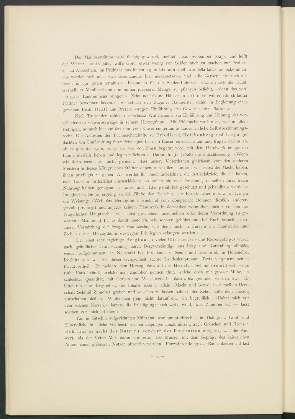 Der Maulbeerbäume wird fleissig gewartet, meldet Taxis (September 1625), und hofft der Wärter, «auf’s Jahr, will’s Gott, etwas wenig von Seiden auch zu machen zur Proba»; er hat Aussichten, im Frühjahr aus Italien «gute laboratori dell’ arte della lana» zu bekommen; «es werden sich auch zwo Eisenhändler hier niedersetzen», und «die Gerberei ist auch allbereit in gar guten terminis.» Besonders für die Seiden-Industrie erwärmt sich der Fürst, weshalb er Maulbeerbäume in immer grösserer Menge zu pflanzen befiehlt, «denn das wird ein gross Einkommens bringen.» Zehn neuerbaute Häuser in Gitschin will er «durch lauter Plattner bewohnen lassen.» Er schickt den Saganer Baumeister dahin in Begleitung eines gewissen Beato Beati aus Brescia «wegen Einführung des Gewerbes der Plattner.»