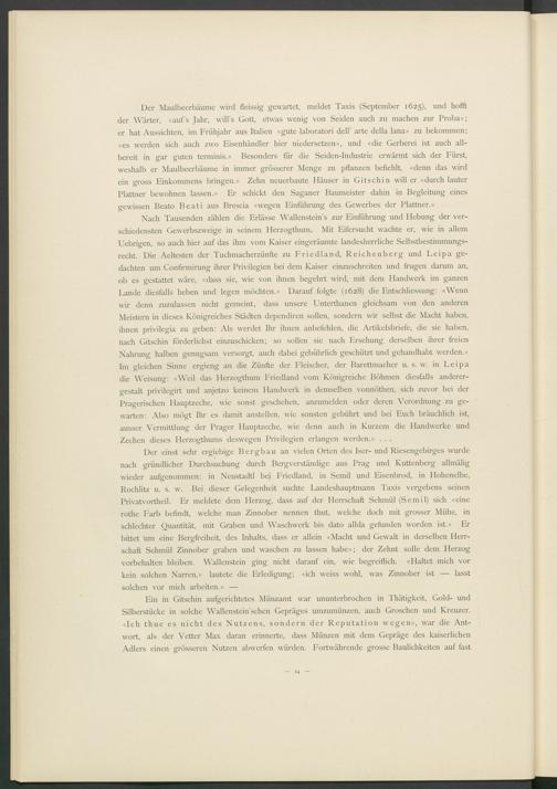 Nach Tausenden zählen die Erlässe Wallenstein’s zur Einführung und Hebung der verschiedensten Gewerbszweige in seinem Herzogthum. Mit Eifersucht wachte er, wie in allem Uebrigen, so auch hier auf das ihm vom Kaiser eingeräumte landesherrliche Selbstbestimmungsrecht. Die Aeltesten der Tuchmacherzünfte zu Friedland, Reichenberg und Leipa gedachten um Confirmirung ihrer Privilegien bei dem Kaiser einzuschreiten und trugen darum an, ob es gestattet wäre, «dass sie, wie von ihnen begehrt wird, mit dem Handwerk im ganzen Lande diesfalls heben und legen möchten.» Darauf folgte (1628) die Entschliessung: «Wenn wir denn zuzulassen nicht gemeint, dass unsere Unterthanen gleichsam von den anderen Meistern in dieses Königreiches Städten dependiren sollen, sondern wir selbst die Macht haben, ihnen privilegia zu geben: Als werdet Ihr ihnen anbefehlen, die Artikelsbriefe, die sie haben, nach Gitschin förderlichst einzuschicken; so sollen sie nach Ersehung derselben ihrer freien Nahrung halben genugsam versorgt, auch dabei gebührlich geschützt und gehandhabt werden.» Im gleichen Sinne ergieng an die Zünfte der Fleischer, der Barettmacher u. s. w. in Leipa die Weisuner: «Weil das Herzogthum Friedland vom Königreiche Böhmen diesfalls anderer- gestalt privilegirt und anjetzo keinem Handwerk in demselben vonnöthen, sich zuvor bei der Pragerischen Hauptzeche, wie sonst geschehen, anzumelden oder deren Verordnung zu ge- warten: Also mögt Ihr es damit anstellen, wie sonsten gebührt und bei Euch bräuchlich ist, ausser Vermittlung der Prager Hauptzeche, wie denn auch in Kurzem die Handwerke und Zechen dieses Herzogthums deswegen Privilegien erlangen werden.» . . .