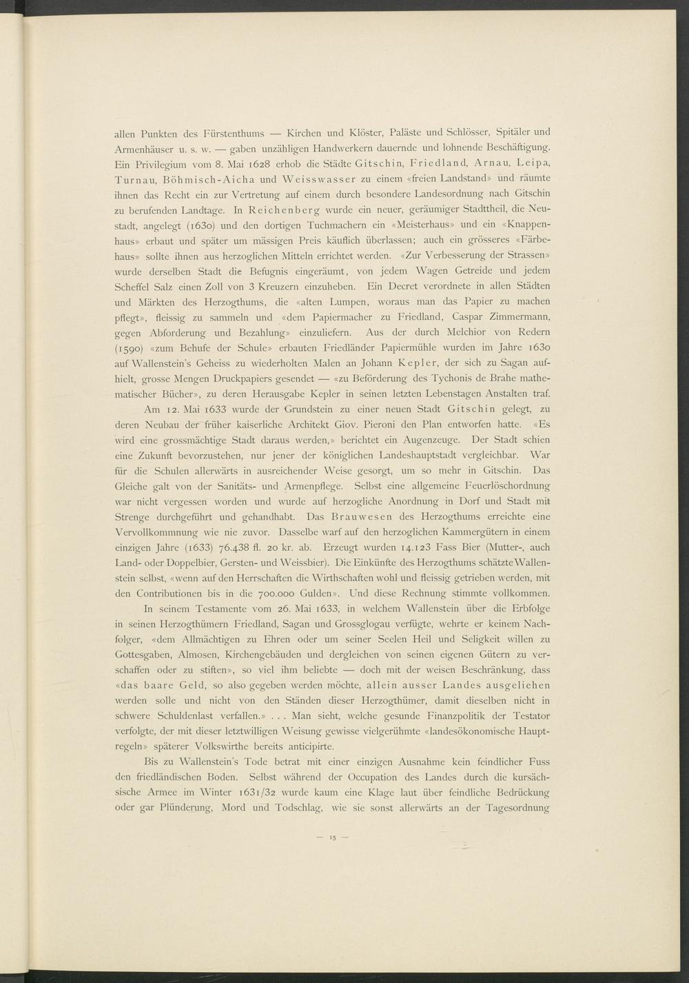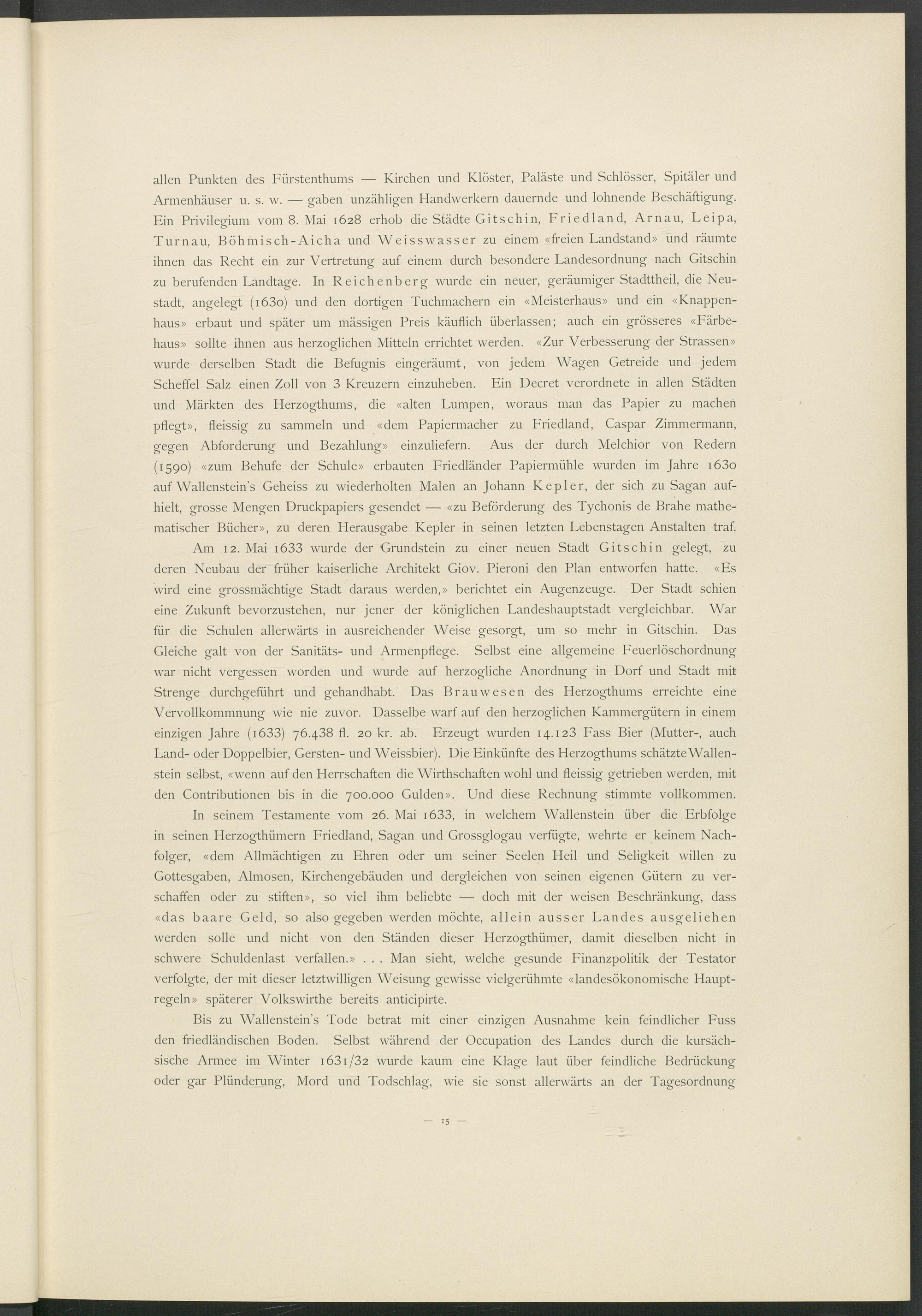 allen Punkten des Fürstenthums — Kirchen und Klöster, Paläste und Schlösser, Spitäler und Armenhäuser u. s. w. — gaben unzähligen Handwerkern dauernde und lohnende Beschäftigung. Ein Privilegium vom 8. Mai 1628 erhob die Städte Gitschin, Friedland, Arnau, Leipa, Turnau, Böhmisch-Aicha und Weisswasser zu einem «freien Landstand» und räumte ihnen das Recht ein zur Vertretung auf einem durch besondere Landesordnung nach Gitschin zu berufenden Landtage. In Reichenberg wurde ein neuer, geräumiger Stadttheil, die Neustadt, angelegt (r63o) und den dortigen Tuchmachern ein «Meisterhaus» und ein «Knappenhaus» erbaut und später um mässigen Preis käuflich überlassen; auch ein grösseres «Färbehaus» sollte ihnen aus herzoglichen Mitteln errichtet werden. «Zur Verbesserung der Strassen» wurde derselben Stadt die Befugnis eingeräumt, von jedem Wagen Getreide und jedem Scheffel Salz einen Zoll von 3 Kreuzern einzuheben. Ein Decret verordnete in allen Städten und Märkten des Herzogthums, die «alten Lumpen, woraus man das Papier zu machen pflegt», fleissig zu sammeln und «dem Papiermacher zu Friedland, Caspar Zimmermann, gegen Abforderung und Bezahlung» einzuliefern. Aus der durch Melchior von Redern (1590) «zum Behufe der Schule» erbauten Friedländer Papiermühle wurden im Jahre i63o auf Wallenstein’s Geheiss zu wiederholten Malen an Johann Kepler, der sich zu Sagan aufhielt, grosse Mengen Druckpapiers gesendet — «zu Beförderung des Tychonis de Brahe mathematischer Bücher», zu deren Herausgabe Kepler in seinen letzten Lebenstagen Anstalten traf.