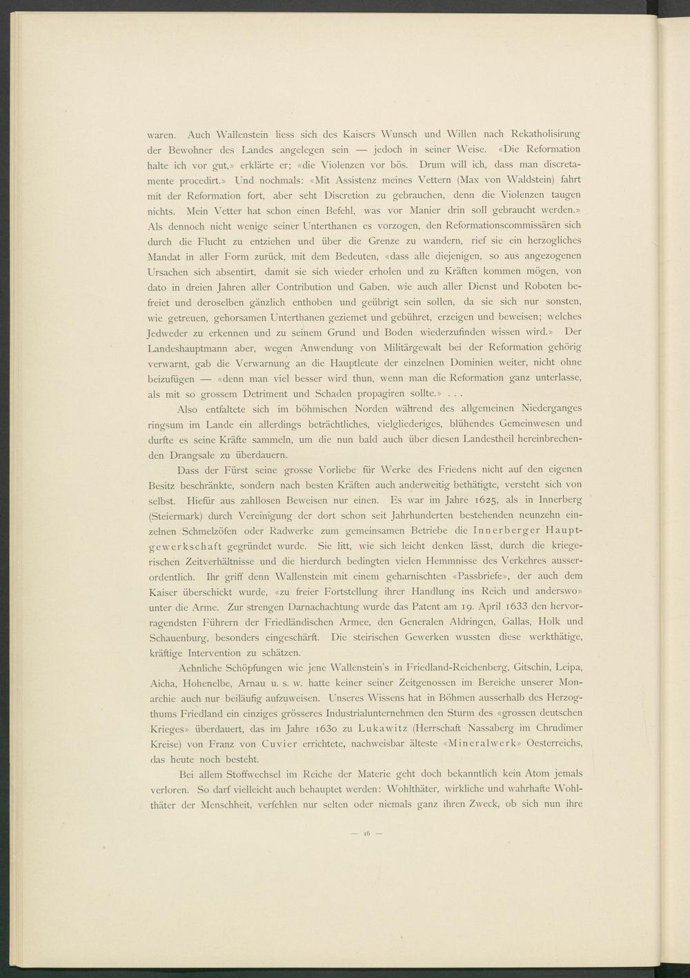 Aehnliche Schöpfungen wie jene Wallenstein’s in Friedland-Reichenberg, Gitschin, Leipa, Aicha, Hohenelbe, Arnau u. s. w. hatte keiner seiner Zeitgenossen im Bereiche unserer Monarchie auch nur beiläufig aufzuweisen. Unseres Wissens hat in Böhmen ausserhalb des Herzogthums Friedland ein einziges grösseres Industrialunternehmen den Sturm des «grossen deutschen Krieges» überdauert, das im Jahre i63o zu Lukawitz (Herrschaft Nassaberg im Chrudimer Kreise) von Franz von Cu vier errichtete, nachweisbar älteste «Mineral werk» Oesterreichs, das heute noch besteht.