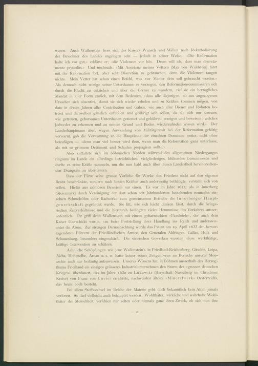 Dass der Fürst seine grosse Vorliebe für Werke des Friedens nicht auf den eigenen Besitz beschränkte, sondern nach besten Kräften auch anderweitig bethätigte, versteht sich von selbst. Fhefür aus zahllosen Beweisen nur einen. Es war im Jahre 1625, als in Innerberg (Steiermark) durch Vereinigung der dort schon seit Jahrhunderten bestehenden neunzehn einzelnen Schmelzöfen oder Radwerke zum gemeinsamen Betriebe die Innerberger Hauptgewerkschaft gegründet wurde. Sie litt, wie sich leicht denken lässt, durch die kriegerischen Zeitverhältnisse und die hierdurch bedingten vielen Hemmnisse des Verkehres ausserordentlich. Ihr griff denn Wallenstein mit einem geharnischten «Passbriefe», der auch dem Kaiser überschickt wurde, «zu freier Fortstellung ihrer Handlung ins Reich und anderswo» unter die Arme. Zur strengen Darnachachtung wurde das Patent am 19. April i633 den hervorragendsten Führern der Friedländischen Armee, den Generalen Aldringen, Gallas, Holk und Schauenburg, besonders eingeschärft. Die steirischen Gewerken wussten diese werkthätige, kräftige Intervention zu schätzen.