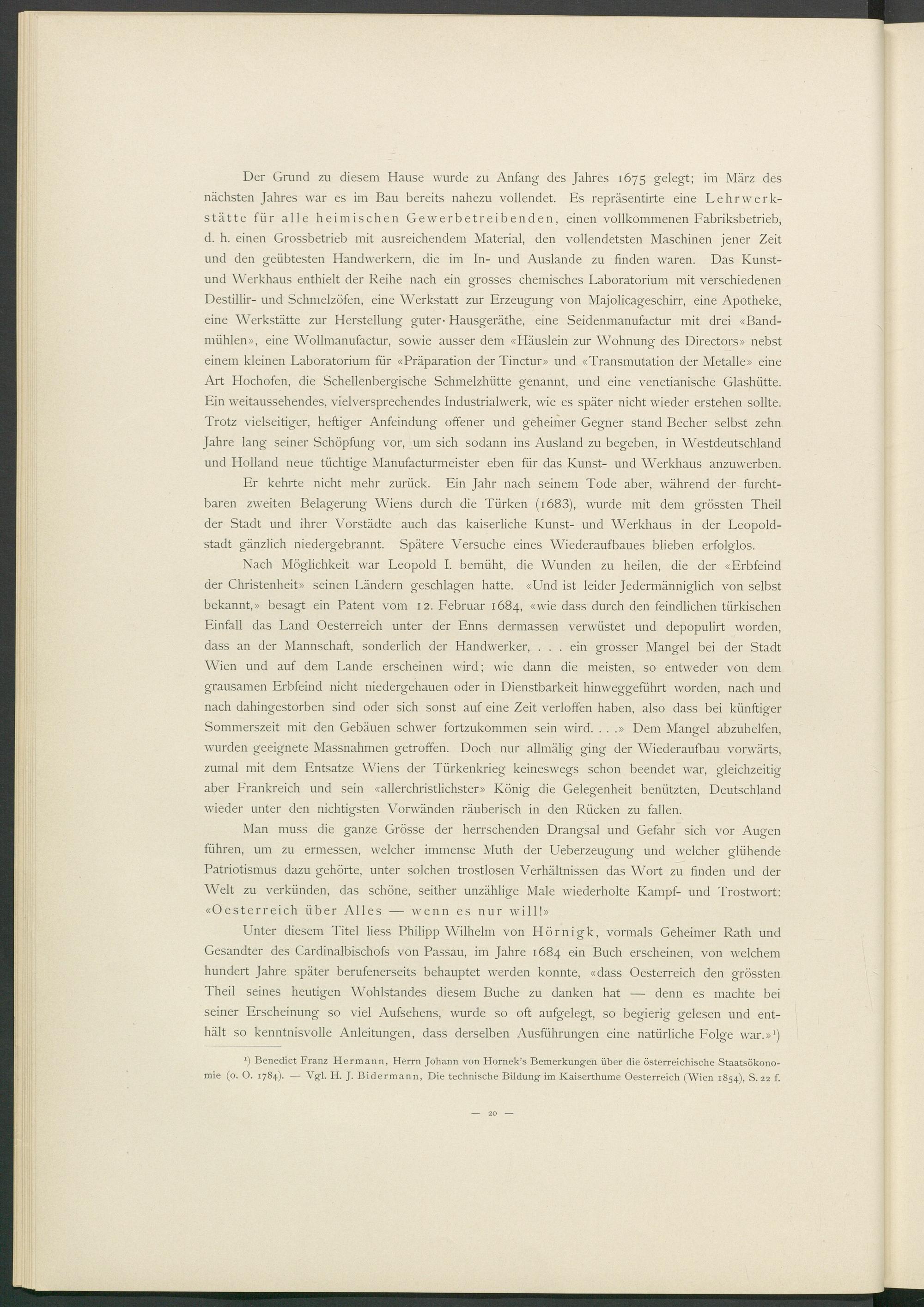 Unter diesem Titel liess Philipp Wilhelm von Hörnigk, vormals Geheimer Rath und Gesandter des Cardinalbischofs von Passau, im Jahre 1684 ein Buch erscheinen, von welchem hundert Jahre später berufenerseits behauptet werden konnte, «dass Oesterreich den grössten Theil seines heutigen Wohlstandes diesem Buche zu danken hat denn es machte bei seiner Erscheinung so viel Aufsehens, wurde so oft aufgelegt, so begierig gelesen und ent­hält so kenntnisvolle Anleitungen, dass derselben Ausführungen eine natürliche Folge war.» 1 )