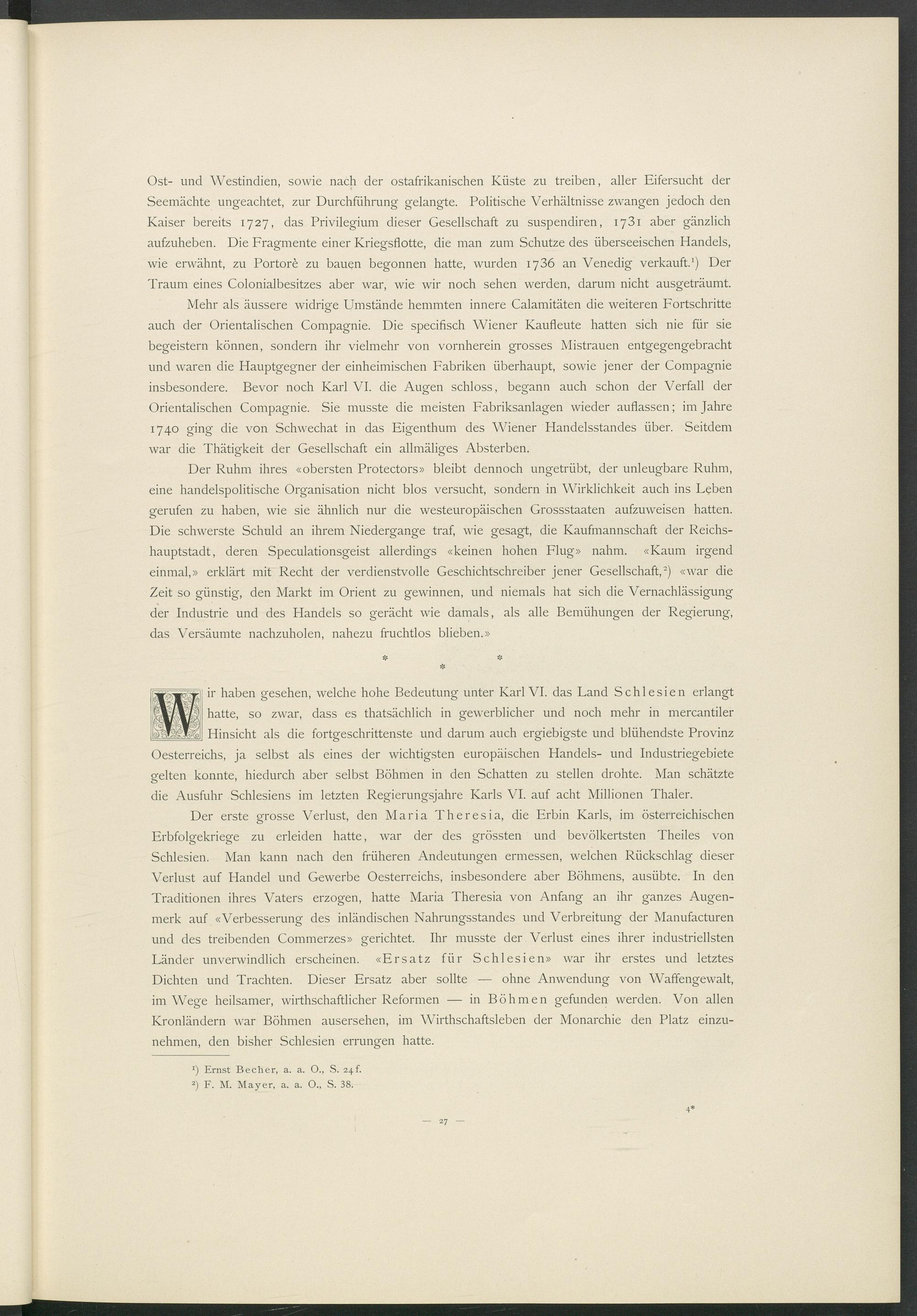 Ost- und Westindien, sowie nach der ostafrikanischen Küste zu treiben, aller Eifersucht der Seemächte ungeachtet, zur Durchführung gelangte. Politische Verhältnisse zwangen jedoch den Kaiser bereits 1727, das Privilegium dieser Gesellschaft zu suspendiren, 1731 aber gänzlich aufzuheben. Die Fragmente einer Kriegsflotte, die man zum Schutze des überseeischen Handels, wie erwähnt, zu Portorö zu bauen begonnen hatte, wurden 1736 an Venedig verkauft. 1 ) Der Traum eines Colonialbesitzes aber war, wie wir noch sehen werden, darum nicht ausgeträumt.