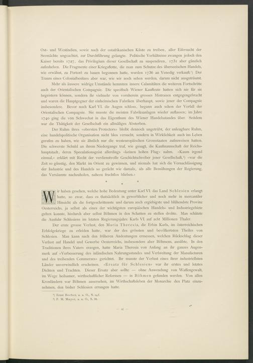 ir haben gesehen, welche hohe Bedeutung unter Karl VI. das Fand Schlesien erlangt hatte, so zwar, dass es thatsächlich in gewerblicher und noch mehr in mercantiler Hinsicht als die fortgeschrittenste und darum auch ergiebigste und blühendste Provinz Oesterreichs, ja selbst als eines der wichtigsten europäischen Handels- und Industriegebiete gelten konnte, hiedurch aber selbst Böhmen in den Schatten zu stellen drohte. Man schätzte die Ausfuhr Schlesiens im letzten Regierungsjahre Karls VI. auf acht Millionen Thaler.
