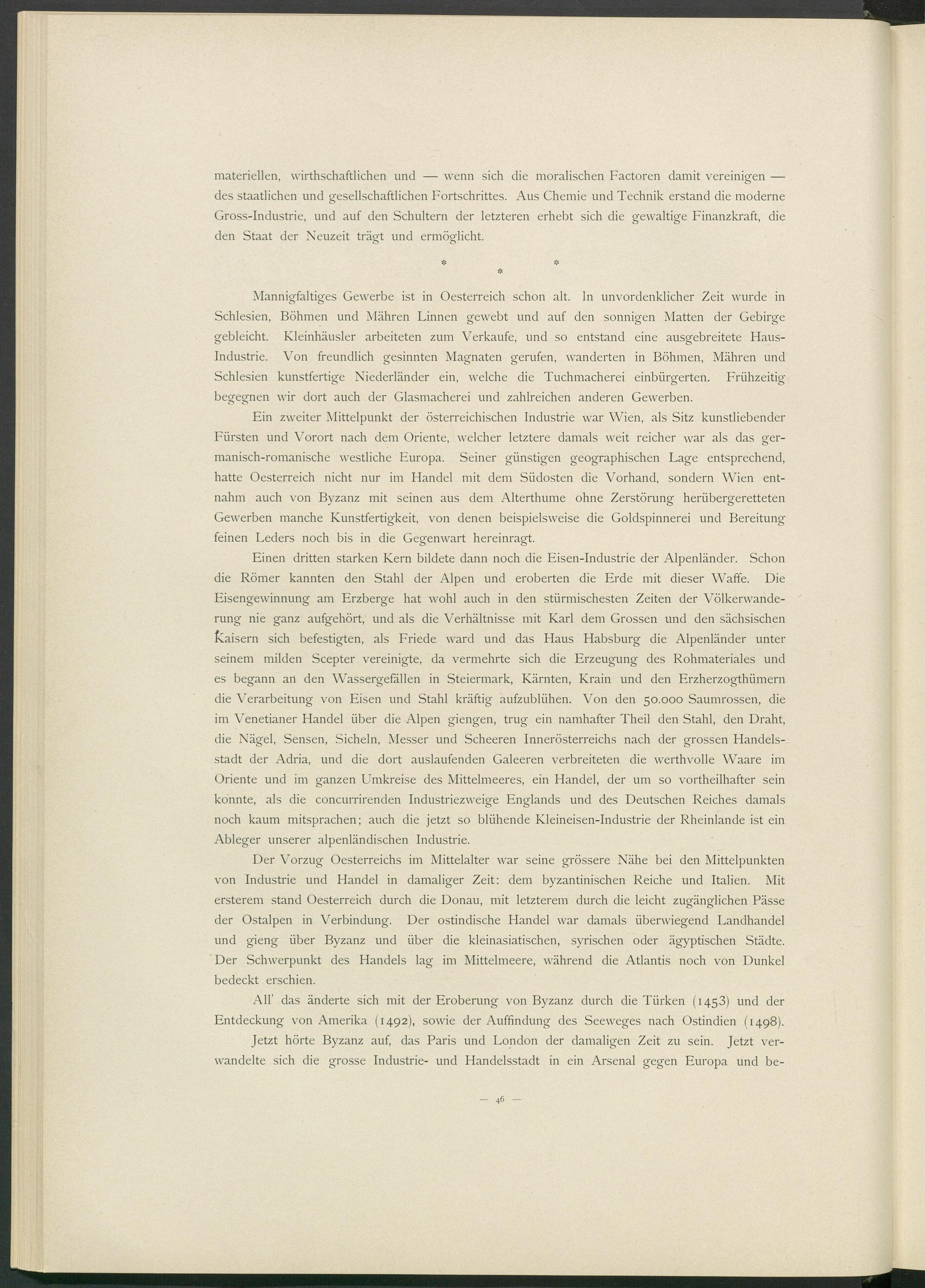 Ein zweiter Mittelpunkt der österreichischen Industrie war Wien, als Sitz kunstliebender Fürsten und Vorort nach dem Oriente, welcher letztere damals weit reicher war als das germanisch-romanische westliche Europa. Seiner günstigen geographischen Lage entsprechend, hatte Oesterreich nicht nur im Handel mit dem Südosten die Vorhand, sondern Wien entnahm auch von Byzanz mit seinen aus dem Alterthume ohne Zerstörung herübergeretteten Gewerben manche Kunstfertigkeit, von denen beispielsweise die Goldspinnerei und Bereitung feinen Leders noch bis in die Gegenwart hereinragt.