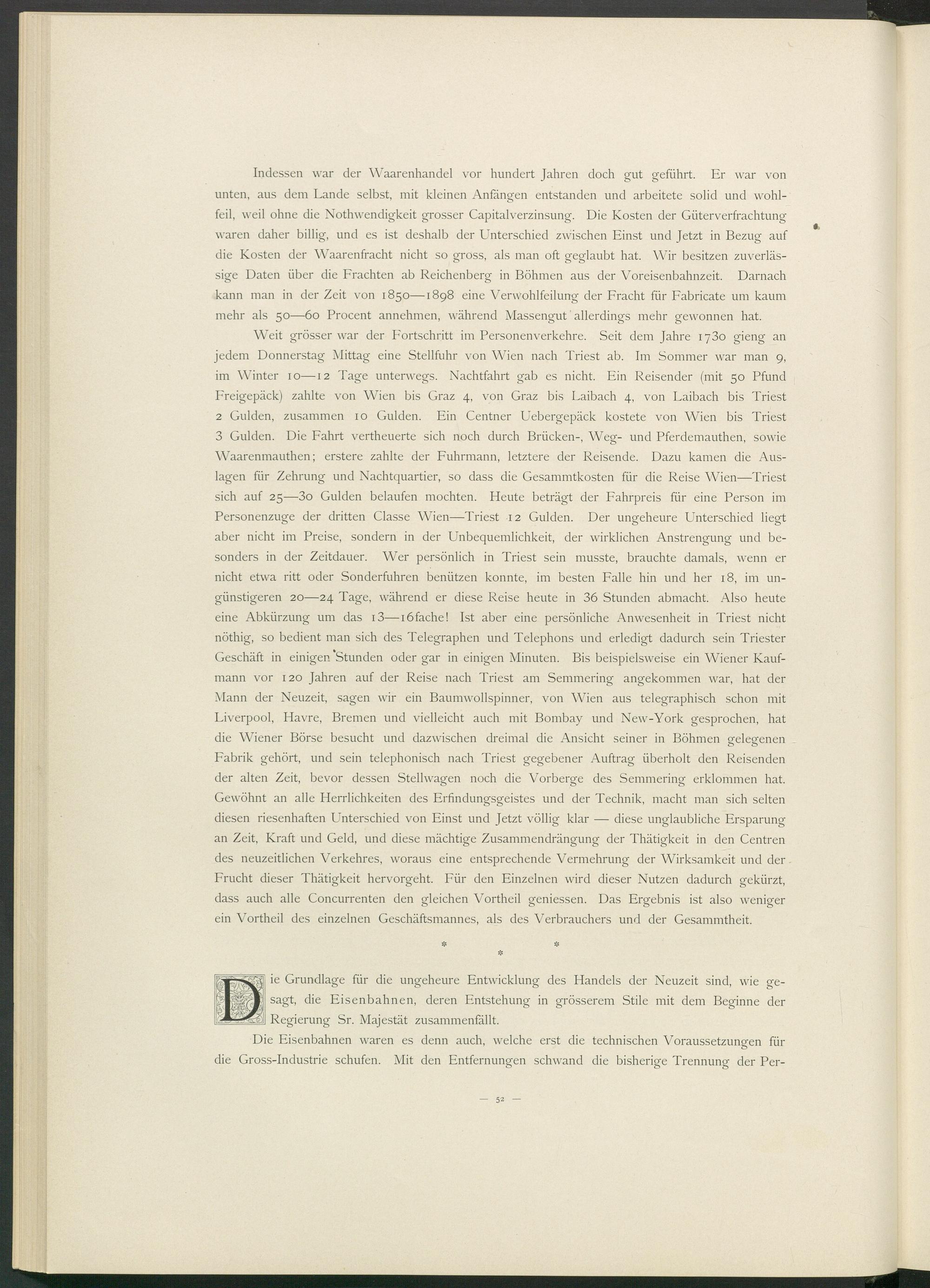 3 Gulden. Die Fahrt vertheuerte sich noch durch Brücken-, Weg- und Pferdemauthen, sowie Waarenmauthen; erstere zahlte der Fuhrmann, letztere der Reisende. Dazu kamen die Auslagen für Zehrung und Nachtquartier, so dass die Gesammtkosten für die Reise Wien—Triest sich auf 25—3o Gulden belaufen mochten. Heute beträgt der Fahrpreis für eine Person im Personenzuge der dritten Classe Wien—Triest 12 Gulden. Der ungeheure Unterschied liegt aber nicht im Preise, sondern in der Unbequemlichkeit, der wirklichen Anstrengung und besonders in der Zeitdauer. Wer persönlich in Triest sein musste, brauchte damals, wenn er nicht etwa ritt oder Sonderfuhren benützen konnte, im besten Falle hin und her 18, im ungünstigeren 20—24 Tage, während er diese Reise heute in 36 Stunden abmacht. Also heute eine Abkürzung um das i3—iöfache! Ist aber eine persönliche Anwesenheit in Triest nicht nöthig, so bedient man sich des Telegraphen und Telephons und erledigt dadurch sein Triester Geschäft in einigen Stunden oder gar in einigen Minuten. Bis beispielsweise ein Wiener Kaufmann vor 120 Jahren auf der Reise nach Triest am Semmering angekommen war, hat der Mann der Neuzeit, sagen wir ein Baumwollspinner, von Wien aus telegraphisch schon mit Liverpool, Havre, Bremen und vielleicht auch mit Bombay und New-York gesprochen, hat die Wiener Börse besucht und dazwischen dreimal die Ansicht seiner in Böhmen gelegenen Fabrik gehört, und sein telephonisch nach Triest gegebener Auftrag überholt den Reisenden der alten Zeit, bevor dessen Stell wagen noch die Vorberge des Semmering erklommen hat. Gewöhnt an alle Herrlichkeiten des Erfindungsgeistes und der Technik, macht man sich selten diesen riesenhaften Unterschied von Einst und Jetzt völlig klar — diese unglaubliche Ersparung an Zeit, Kraft und Geld, und diese mächtige Zusammendrängung der Thätigkeit in den Centren des neuzeitlichen Verkehres, woraus eine entsprechende Vermehrung der Wirksamkeit und der Frucht dieser Thätigkeit hervorgeht. Für den Einzelnen wird dieser Nutzen dadurch gekürzt, dass auch alle Concurrenten den gleichen Vortheil geniessen. Das Ergebnis ist also weniger ein Vortheil des einzelnen Geschäftsmannes, als des Verbrauchers und der Gesammtheit.
