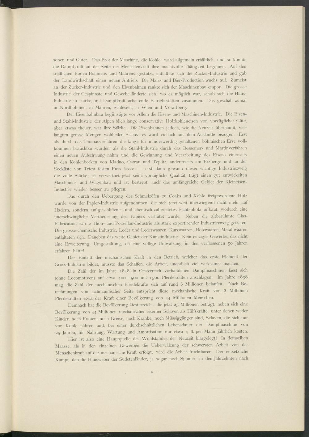 Die Zahl der im Jahre 1848 in Oesterreich vorhandenen Dampfmaschinen lässt sich (ohne Locomotiven) auf etwa 400—500 mit 1500 Pferdekräften anschlagen. Im Jahre 1898 masf die Zahl der mechanischen Pferdekräfte sich auf rund 3 Millionen belaufen. Nach Be- rechnungen von fachmännischer Seite entspricht diese mechanische Kraft von 3 Millionen Pferdekräften etwa der Kraft einer Bevölkerung von 44 Millionen Menschen.