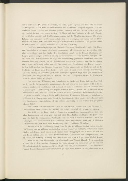 sonen und Güter. Das Brot der Maschine, die Kohle, ward allgemein erhältlich, und so konnte die Dampfkraft an der Seite der Menschenkraft ihre machtvolle Thätigkeit beginnen. Auf den trefflichen Boden Böhmens und Mährens gestützt, entfaltete sich die Zucker-Industrie und gab der Landwirtschaft einen neuen Antrieb. Die Malz- und Bier-Production wuchs auf. Zumeist an der Zucker-Industrie und den Eisenbahnen rankte sich der Maschinenbau empor. Die grosse Industrie der Gespinnste und Gewebe änderte sich; wo es möglich war, schob sich die Hausindustrie in starke, mit Dampfkraft arbeitende Betriebsstätten zusammen. Das geschah zumal in Nordböhmen, in Mähren, Schlesien, in Wien und Vorarlberg.