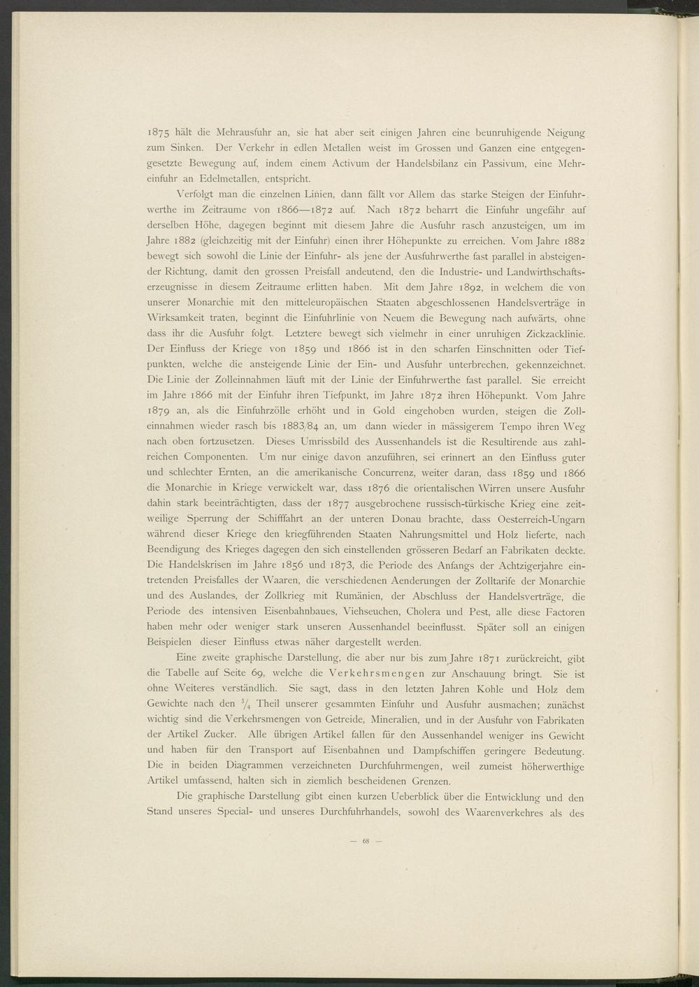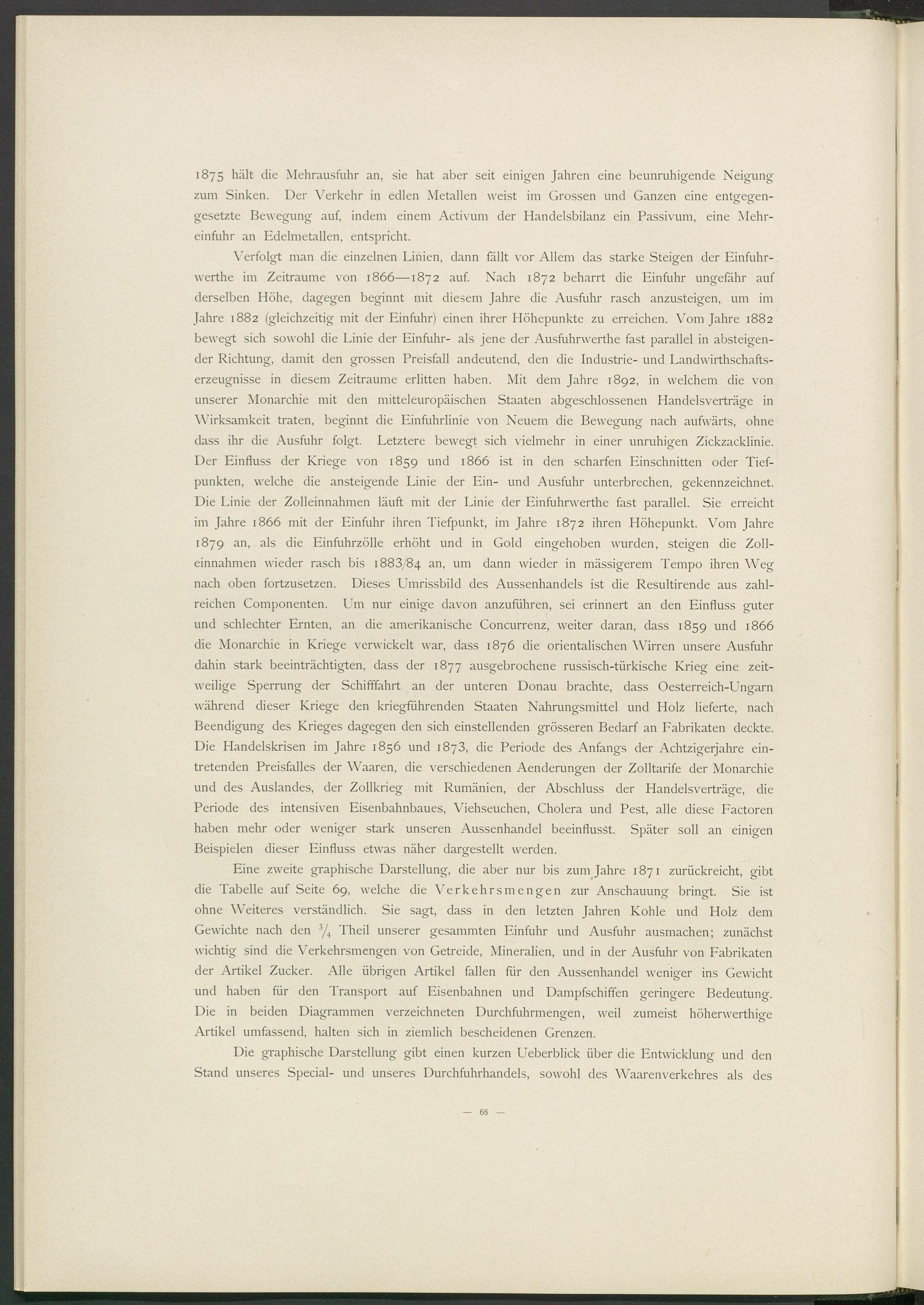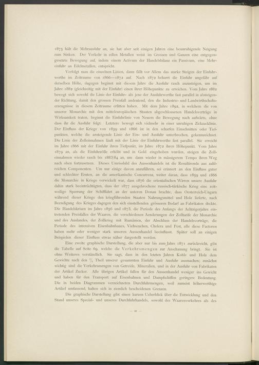 Verfolgt man die einzelnen Linien, dann fällt vor Allem das starke Steigen der Einfuhr- werthe im Zeiträume von 1866—1872 auf. Nach 1872 beharrt die Einfuhr ungefähr auf derselben Höhe, dagegen beginnt mit diesem Jahre die Ausfuhr rasch anzusteigen, um im Jahre 1882 (gleichzeitig mit der Einfuhr) einen ihrer Höhepunkte zu erreichen. Vom Jahre 1882 bewegt sich sowohl die Linie der Einfuhr- als jene der Ausfuhrwerthe fast parallel in absteigender Richtung, damit den grossen Preisfall andeutend, den die Industrie- und Landwirthschafts- erzeugnisse in diesem Zeiträume erlitten haben. Mit dem Jahre 1892, in welchem die von unserer Monarchie mit den mitteleuropäischen Staaten abgeschlossenen Handelsverträge in Wirksamkeit traten, beginnt die Einfuhrlinie von Neuem die Bewegung nach aufwärts, ohne dass ihr die Ausfuhr folgt. Letztere bewegt sich vielmehr in einer unruhigen Zickzacklinie. Der Einfluss der Kriege von 1859 und 1866 ist in den scharfen Einschnitten oder Tiefpunkten, welche die ansteigende Linie der Ein- und Ausfuhr unterbrechen, gekennzeichnet. Die Linie der Zolleinnahmen läuft mit der Linie der Einfuhrwerthe fast parallel. Sie erreicht im Jahre 1866 mit der Einfuhr ihren Tiefpunkt, im Jahre 1872 ihren Höhepunkt. Vom Jahre 1879 an, als die Einfuhrzölle erhöht und in Gold eingehoben wurden, steigen die Zolleinnahmen wieder rasch bis 1883/84 an > um dann wieder in mässigerem Tempo ihren Weg nach oben fortzusetzen. Dieses Umrissbild des Aussenhandels ist die Resultirende aus zahlreichen Componenten. Um nur einige davon anzuführen, sei erinnert an den Einfluss guter und schlechter Ernten, an die amerikanische Concurrenz, weiter daran, dass 1859 und 1866 die Monarchie in Kriege verwickelt war, dass 1876 die orientalischen Wirren unsere Ausfuhr dahin stark beeinträchtigten, dass der 1877 ausgebrochene russisch-türkische Krieg eine zeitweilige Sperrung der Schifffahrt an der unteren Donau brachte, dass Oesterreich-Ungarn während dieser Kriege den kriegführenden Staaten Nahrungsmittel und Holz lieferte, nach Beendigung des Krieges dagegen den sich einstellenden grösseren Bedarf an Fabrikaten deckte. Die Handelskrisen im Jahre 1856 und 1873, die Periode des Anfangs der Achtzigerjahre eintretenden Preisfalles der Waaren, die verschiedenen Aenderungen der Zolltarife der Monarchie und des Auslandes, der Zollkrieg mit Rumänien, der Abschluss der Handelsverträge, die Periode des intensiven Eisenbahnbaues, Viehseuchen, Cholera und Pest, alle diese Factoren haben mehr oder weniger stark unseren Aussenhandel beeinflusst. Später soll an einigen Beispielen dieser Einfluss etwas näher dargestellt werden.