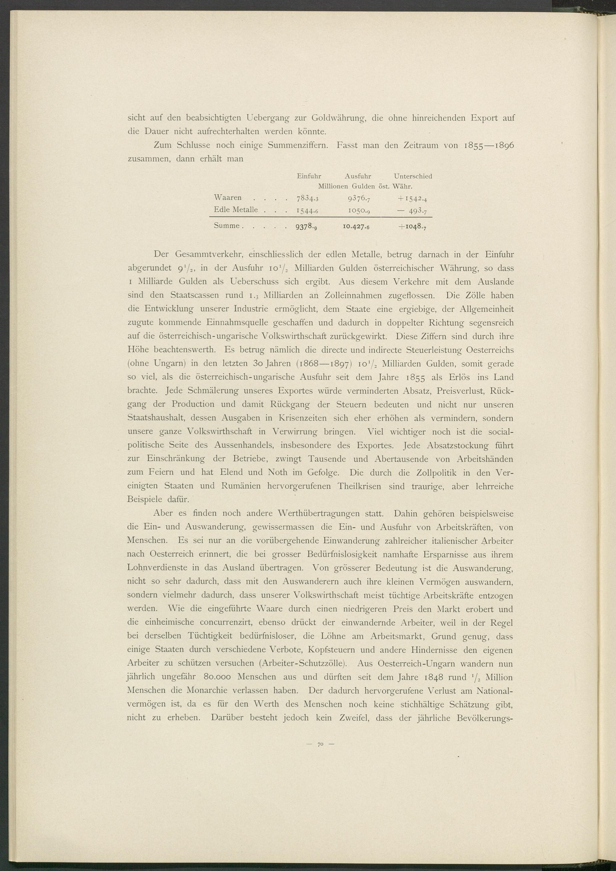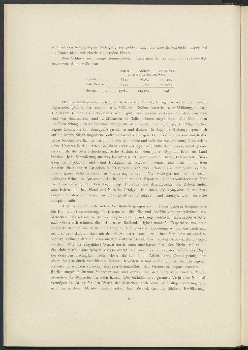 Aber es finden noch andere Werthübertragungen statt. Dahin gehören beispielsweise die Ein- und Auswanderung, gewissermassen die Ein- und Ausfuhr von Arbeitskräften, von Menschen. Es sei nur an die vorübergehende Einwanderung zahlreicher italienischer Arbeiter nach Oesterreich erinnert, die bei grosser Bedürfnislosigkeit namhafte Ersparnisse aus ihrem Lohnverdienste in das Ausland übertragen. Von grösserer Bedeutung ist die Auswanderung, nicht so sehr dadurch, dass mit den Auswanderern auch ihre kleinen Vermögen auswandern, sondern vielmehr dadurch, dass unserer Volkswirthschaft meist tüchtige Arbeitskräfte entzogen werden. Wie die eingeführte Waare durch einen niedrigeren Preis den Markt erobert und die einheimische concurrenzirt, ebenso drückt der einwandernde Arbeiter, weil in der Regel bei derselben Tüchtigkeit bedürfnisloser, die Löhne am Arbeitsmarkt, Grund genug, dass einige Staaten durch verschiedene Verbote, Kopfsteuern und andere Hindernisse den eigenen Arbeiter zu schützen versuchen (Arbeiter-Schutzzölle). Aus Oesterreich-Ungarn wandern nun jährlich ungefähr 80.000 Menschen aus und dürften seit dem Jahre 1848 rund '/ 2 Million Menschen die Monarchie verlassen haben. Der dadurch hervorgerufene Verlust am Nationalvermögen ist, da es für den Werth des Menschen noch keine stichhältige Schätzung gibt, nicht zu erheben. Darüber besteht jedoch kein Zweifel, dass der jährliche Bevölkerungs-