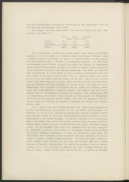 Der Gesammtverkehr, einschliesslich der edlen Metalle, betrug darnach in der Einfuhr abgerundet g l j 2 , in der Ausfuhr 10 l / 2 Milliarden Gulden österreichischer Währung, so dass 1 Milliarde Gulden als Ueberschuss sich ergibt. Aus diesem Verkehre mit dem Auslande sind den Staatscassen rund 1.3 Milliarden an Zolleinnahmen zugeflossen. Die Zölle haben die Entwicklung unserer Industrie ermöglicht, dem Staate eine ergiebige, der Allgemeinheit zugute kommende Einnahmsquelle geschaffen und dadurch in doppelter Richtung segensreich auf die österreichisch-ungarische Volkswirthschaft zurückgewirkt. Diese Ziffern sind durch ihre Flöhe beachtenswerth. Es betrug nämlich die directe und indirecte Steuerleistung Oesterreichs (ohne Ungarn) in den letzten 3o Jahren (1868 —1897) io ! / 2 Milliarden Gulden, somit gerade so viel, als die österreichisch-ungarische Ausfuhr seit dem Jahre 1855 als Erlös ins Land brachte. Jede Schmälerung unseres Exportes würde verminderten Absatz, Preisverlust, Rückgang der Production und damit Rückgang der Steuern bedeuten und nicht nur unseren Staatshaushalt, dessen Ausgaben in Krisenzeiten sich eher erhöhen als vermindern, sondern unsere ganze Volkswirthschaft in Verwirrung bringen. Viel wichtiger noch ist die socialpolitische Seite des Aussenhandels, insbesondere des Exportes. Jede Absatzstockung führt zur Einschränkung der Betriebe, zwingt Tausende und Abertausende von Arbeitshänden zum Feiern und hat Elend und Noth im Gefolge. Die durch die Zollpolitik in den Vereinigten Staaten und Rumänien hervorgerufenen Theilkrisen sind traurige, aber lehrreiche Beispiele dafür.