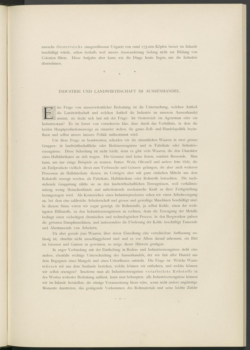 Zuwachs Oesterreichs (ausgeschlossen Ungarn) von rund 175.000 Köpfen besser im Inlande beschäftigt würde, schon deshalb, weil unsere Auswanderung bislang nicht zur Bildung von Colonien führte. Diese Aufgabe aber kann, wie die Dinge heute liegen, nur die Industrie übernehmen.