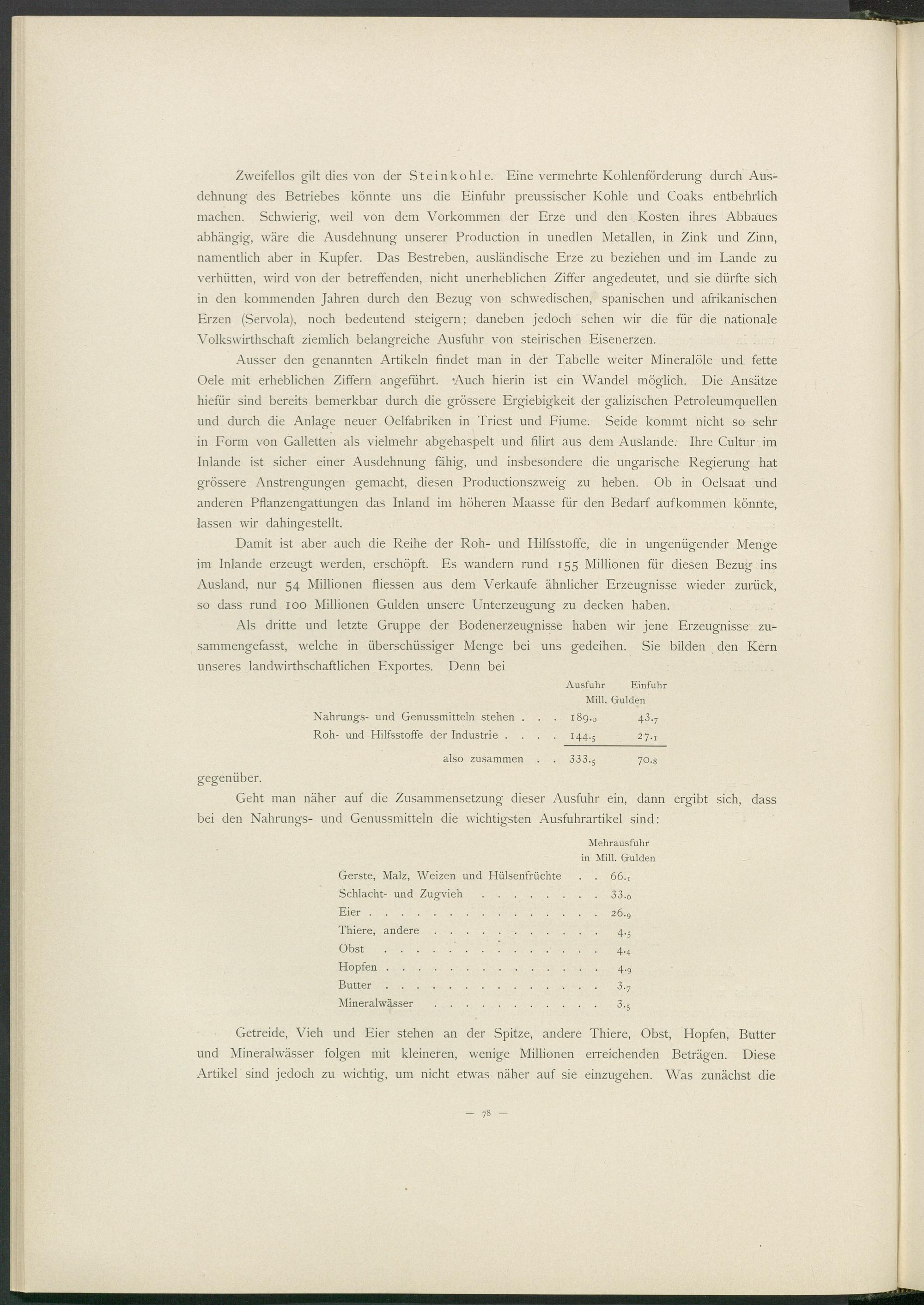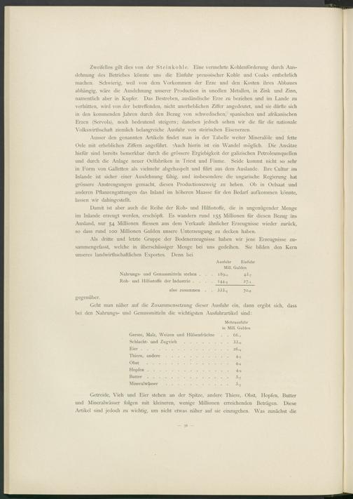 Zweifellos gilt dies von der Steinkohle. Eine vermehrte Kohlenförderung durch Ausdehnung des Betriebes könnte uns die Einfuhr preussischer Kohle und Coaks entbehrlich machen. Schwierig, weil von dem Vorkommen der Erze und den Kosten ihres Abbaues abhängig, wäre die Ausdehnung unserer Production in unedlen Metallen, in Zink und Zinn, namentlich aber in Kupfer. Das Bestreben, ausländische Erze zu beziehen und im Lande zu verhütten, wird von der betreffenden, nicht unerheblichen Ziffer angedeutet, und sie dürfte sich in den kommenden Jahren durch den Bezug von schwedischen, spanischen und afrikanischen Erzen (Servola), noch bedeutend steigern; daneben jedoch sehen wir die für die nationale Volkswirthschaft ziemlich belangreiche Ausfuhr von steirischen Eisenerzen.