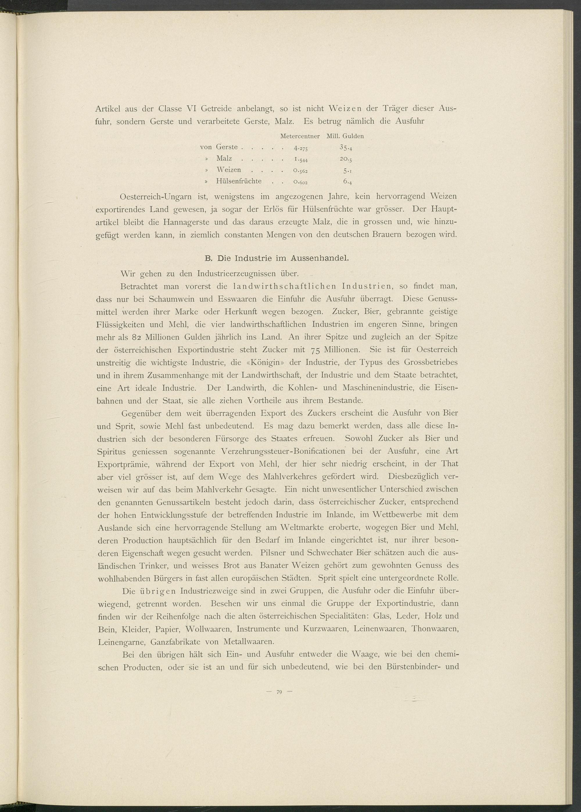 Artikel aus der Classe VI Getreide anbelangt, so ist nicht Weizen der Träger dieser Ausfuhr, sondern Gerste und verarbeitete Gerste, Malz. Es betrug nämlich die Ausfuhr