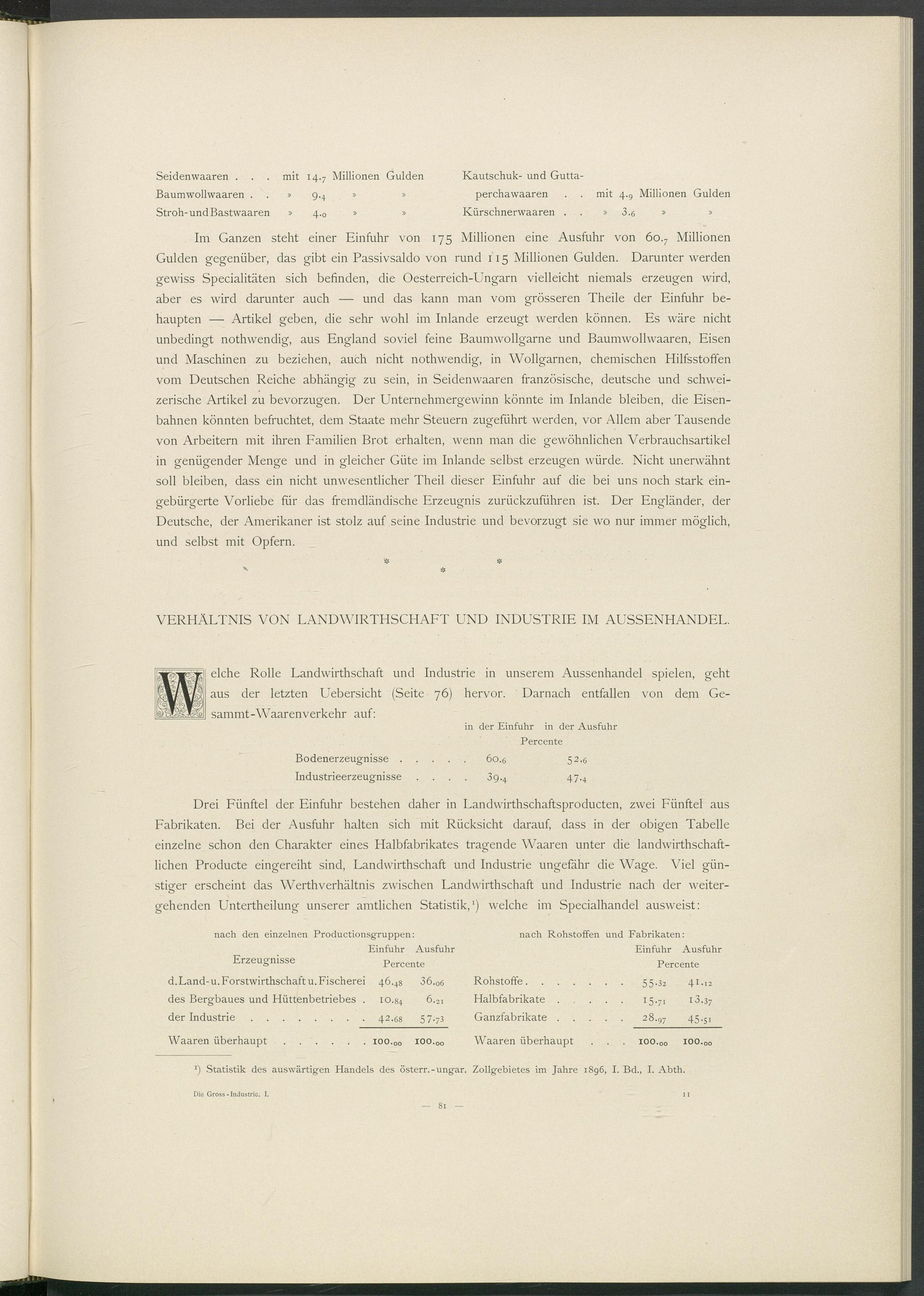 Im Ganzen steht einer Einfuhr von 175 Millionen eine Ausfuhr von 6o. 7 Millionen Gulden gegenüber, das gibt ein Passivsaldo von rund 115 Millionen Gulden. Darunter werden gewiss Specialitäten sich befinden, die Oesterreich-Ungarn vielleicht niemals erzeugen wird, aber es wird darunter auch — und das kann man vom grösseren Theile der Einfuhr behaupten — Artikel geben, die sehr wohl im Inlande erzeugt werden können. Es wäre nicht unbedingt nothwendig, aus England soviel feine Baumwollgarne und Baumwollwaaren, Eisen und Maschinen zu beziehen, auch nicht nothwendig, in Wollgarnen, chemischen Hilfsstoffen vom Deutschen Reiche abhängig zu sein, in Seidenwaaren französische, deutsche und schweizerische Artikel zu bevorzugen. Der Unternehmergewinn könnte im Inlande bleiben, die Eisenbahnen könnten befruchtet, dem Staate mehr Steuern zugeführt werden, vor Allem aber Tausende von Arbeitern mit ihren Familien Brot erhalten, wenn man die gewöhnlichen Verbrauchsartikel in genügender Menge und in gleicher Güte im Inlande selbst erzeugen würde. Nicht unerwähnt soll bleiben, dass ein nicht unwesentlicher Theil dieser Einfuhr auf die bei uns noch stark eingebürgerte Vorliebe für das fremdländische Erzeugnis zurückzuführen ist. Der Engländer, der Deutsche, der Amerikaner ist stolz auf seine Industrie und bevorzugt sie wo nur immer möglich, und selbst mit Opfern. _