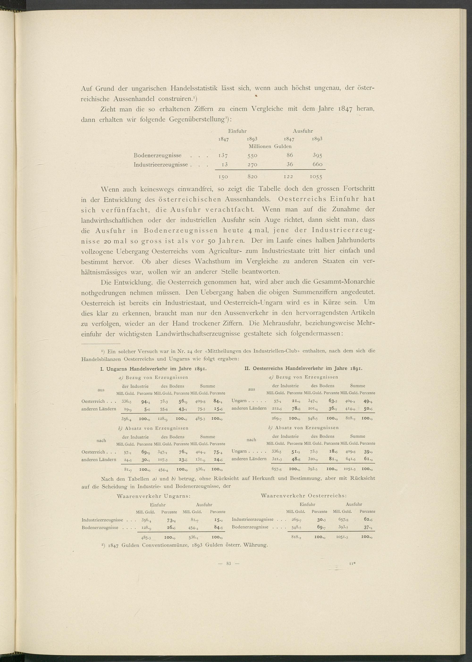 Wenn auch keineswegs einwandfrei, so zeigt die Tabelle doch den grossen Fortschritt in der Entwicklung des österreichischen Aussenhandels. Oesterreichs Einfuhr hat sich verfünffacht, die Ausfuhr verachtfacht. Wenn man auf die Zunahme der landwirthschaftlichen oder der industriellen Ausfuhr sein Auge richtet, dann sieht man, dass die Ausfuhr in Bodenerzeugnissen heute 4 mal, jene der Industrieerzeugnisse 20 mal so gross ist als vor 50 Jahren. Der im Laufe eines halben Jahrhunderts vollzogene Uebergang Oesterreichs vom Agricultur- zum Industriestaate tritt hier einfach und bestimmt hervor. Ob aber dieses Wachsthum im Vergleiche zu anderen Staaten ein verhältnismässiges war, wollen wir an anderer Stelle beantworten.