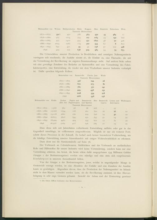 Der Verbrauch an Colonialwaaren, Südfrüchten und der Verbrauch an ausländischen Roh- und Hilfsstoffen für unsere Industrie wird keine Verminderung, sondern kann nur eine Vermehrung erfahren, das heisst, die heute schon dafür ausgegebenen 154 Millionen Gulden (Gruppe 1 der Bodenerzeugnisse) werden eine ständige und eine stets sich vergrössernde Einfuhrpost in unserem Aussenhandel bilden.