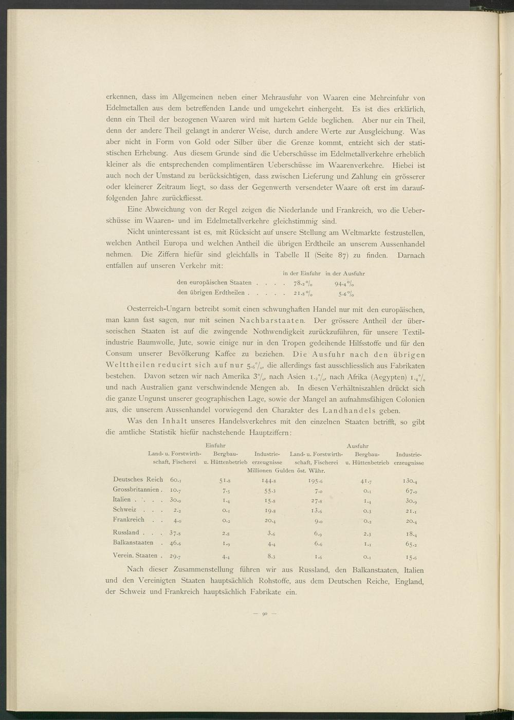 Nicht uninteressant ist es, mit Rücksicht auf unsere Stellung am Weltmärkte festzustellen, welchen Antheil Europa und welchen Antheil die übrigen Erdtheile an unserem Aussenhandel nehmen. Die Ziffern hiefür sind gleichfalls in Tabelle II (Seite 87) zu finden. Darnach entfallen auf unseren Verkehr mit: