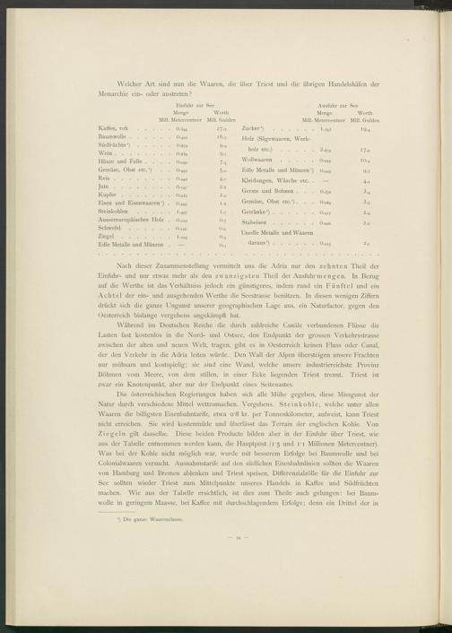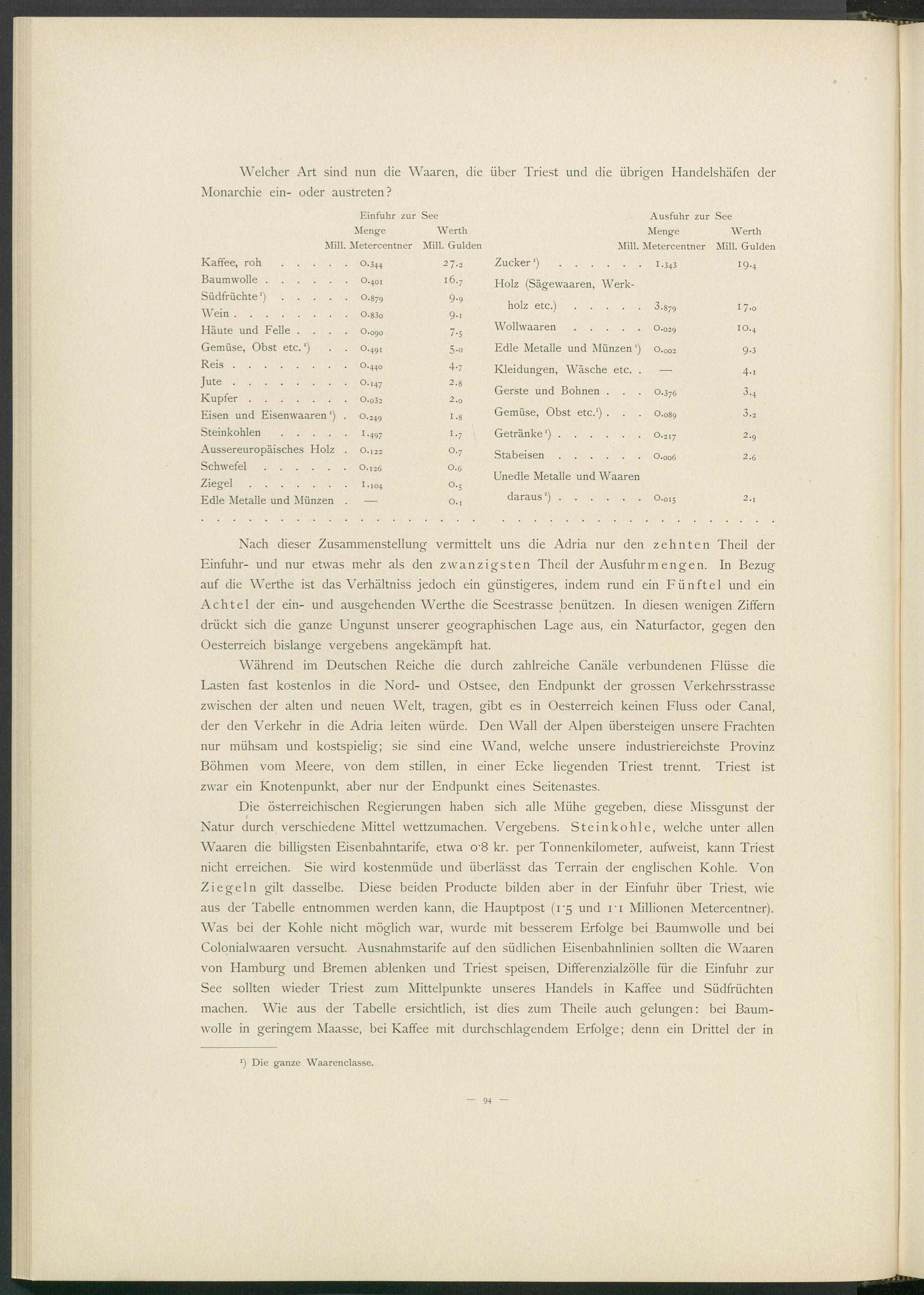 Nach dieser Zusammenstellung vermittelt uns die Adria nur den zehnten Theil der Einfuhr- und nur etwas mehr als den zwanzigsten Theil der Ausfuhr mengen. In Bezug auf die Werthe ist das Verhältniss jedoch ein günstigeres, indem rund ein Fünftel und ein Achtel der ein- und ausgehenden Werthe die Seestrasse benützen. In diesen wenigen Ziffern drückt sich die ganze Ungunst unserer geographischen Lage aus, ein Naturfactor, gegen den Oesterreich bislange vergebens angekämpft hat.
