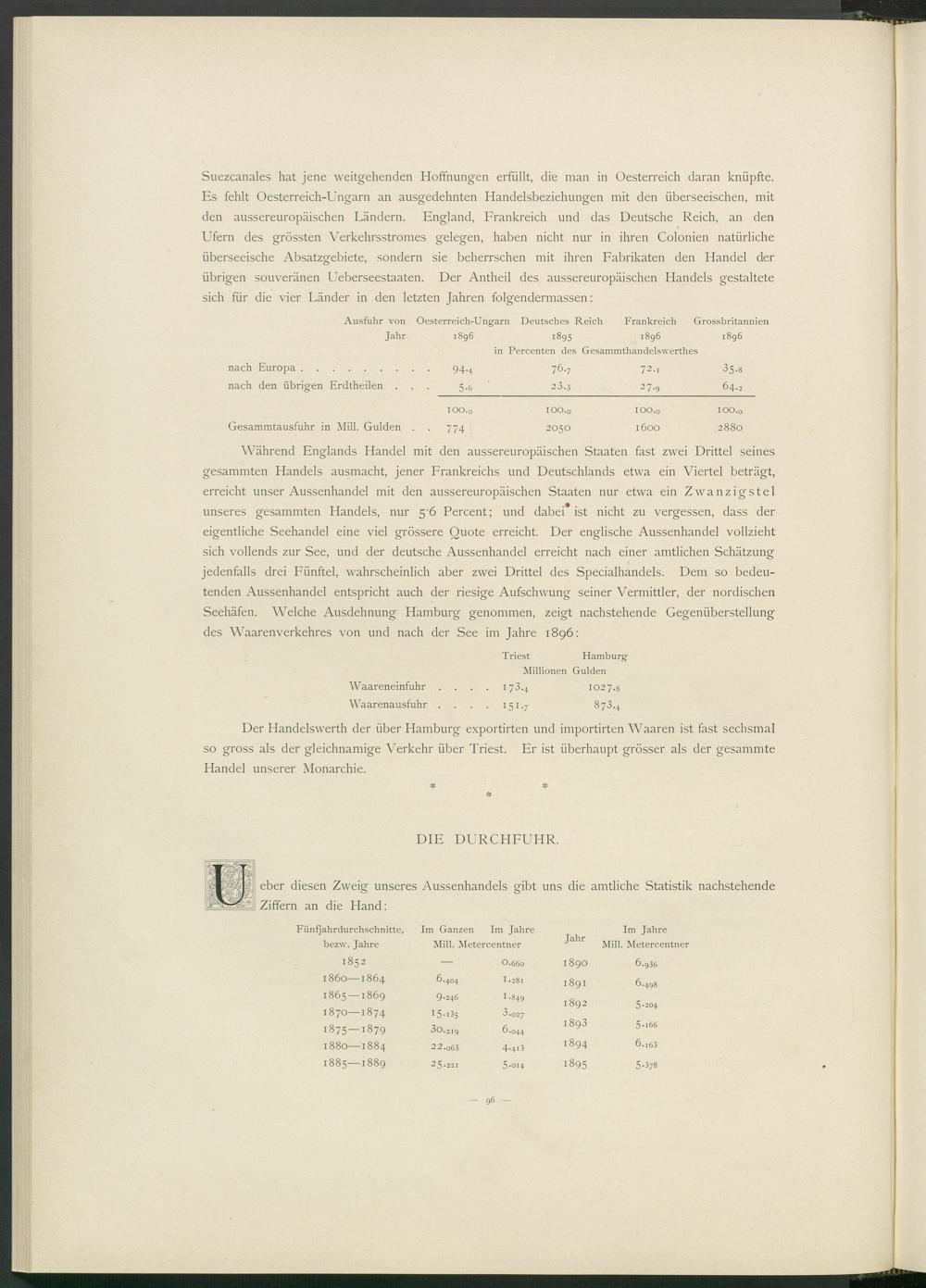 Während Englands Handel mit den aussereuropäischen Staaten fast zwei Drittel seines gesammten Handels ausmacht, jener Frankreichs und Deutschlands etwa ein Viertel beträgt, erreicht unser Aussenhandel mit den aussereuropäischen Staaten nur etwa ein Zwanzigstel unseres gesammten Handels, nur 5’6 Percent; und dabei* ist nicht zu vergessen, dass der eigentliche Seehandel eine viel grössere Quote erreicht. Der englische Aussenhandel vollzieht sich vollends zur See, und der deutsche Aussenhandel erreicht nach einer amtlichen Schätzung jedenfalls drei Fünftel, wahrscheinlich aber zwei Drittel des Specialhandels. Dem so bedeutenden Aussenhandel entspricht auch der riesige Aufschwung seiner Vermittler, der nordischen Seehäfen. Welche Ausdehnung Hamburg genommen, zeigt nachstehende Gegenüberstellung des Waarenverkehres von und nach der See im Jahre 1896: