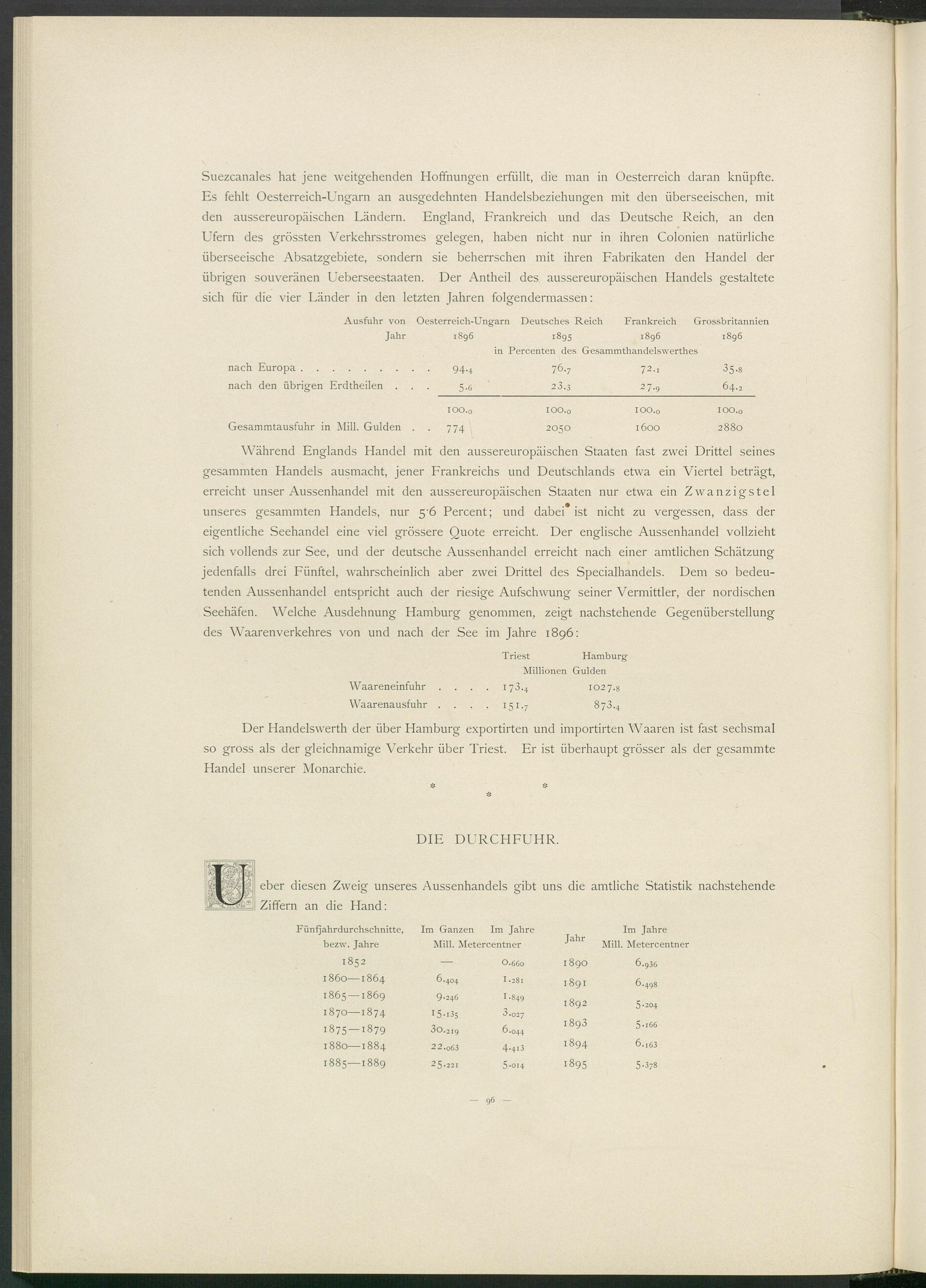 Suezcanales hat jene weitgehenden Hoffnungen erfüllt, die man in Oesterreich daran knüpfte. Es fehlt Oesterreich-Ungarn an ausgedehnten Handelsbeziehungen mit den überseeischen, mit den aussereuropäischen Ländern. England, Frankreich und das Deutsche Reich, an den Ufern des grössten Verkehrsstromes gelegen, haben nicht nur in ihren Colonien natürliche überseeische Absatzgebiete, sondern sie beherrschen mit ihren Fabrikaten den Handel der übrigen souveränen Ueberseestaaten. Der Antheil des aussereuropäischen Handels gestaltete sich für die vier Länder in den letzten Jahren folgendermassen: