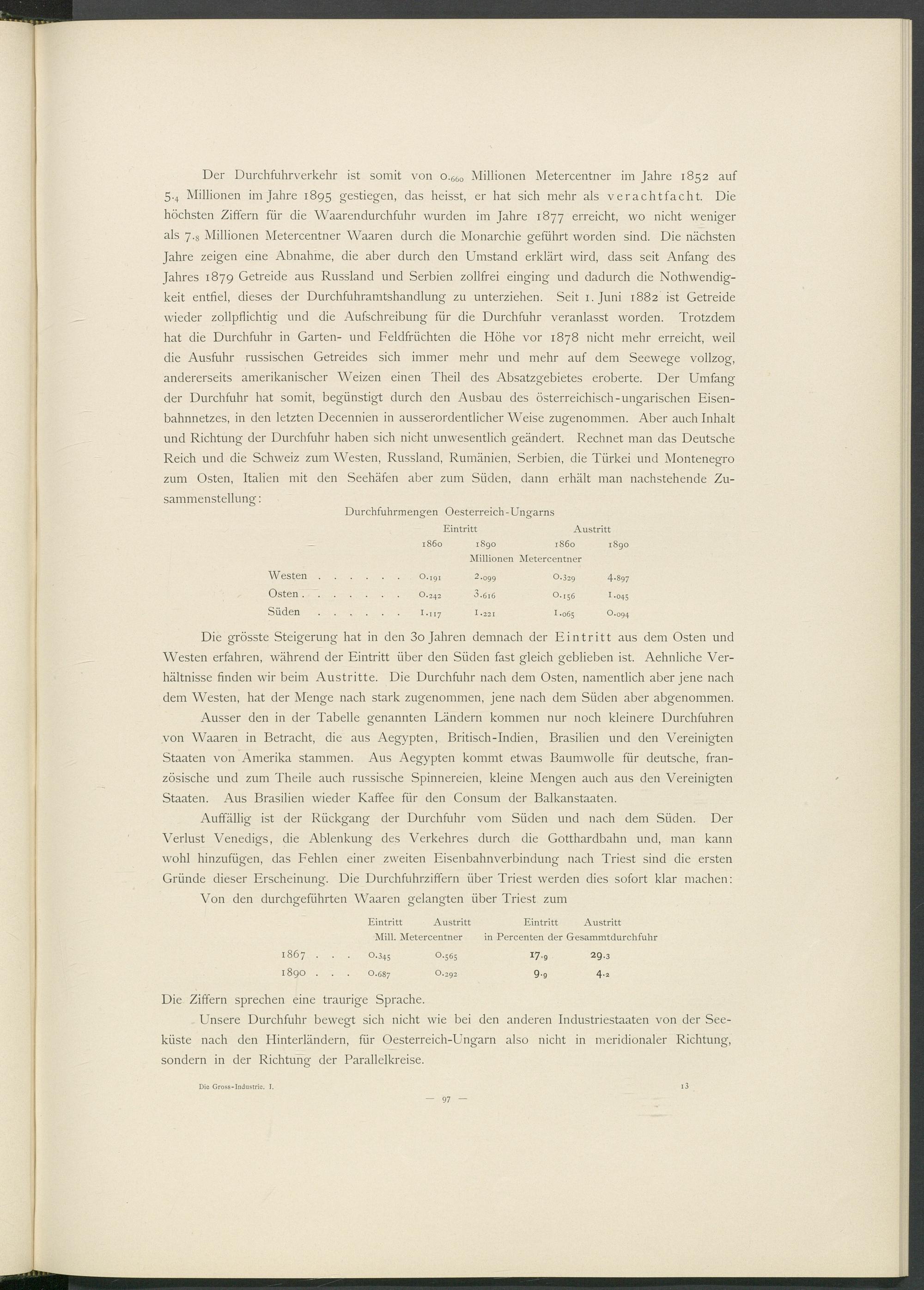 Auffällig ist der Rückgang der Durchfuhr vom Süden und nach dem Süden. Der Verlust Venedigs, die Ablenkung des Verkehres durch die Gotthardbahn und, man kann wohl hinzufügen, das Fehlen einer zweiten Eisenbahnverbindung nach Triest sind die ersten Gründe dieser Erscheinung. Die Durchfuhrziffern über Triest werden dies sofort klar machen: